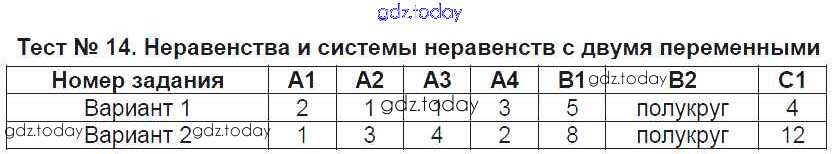 Ответы к Решение к тестам Тест №14. Неравенства и системы неравенств с двумя переменными Контрольно-измерительным материалам (КИМ) по Алгебре для 9 класса Мартышова ВАКО 2015