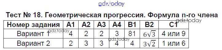 Ответы к Решение к тестам Тест №18. Геометрическая прогрессия. Формула n-го члена Контрольно-измерительным материалам (КИМ) по Алгебре для 9 класса Мартышова ВАКО 2015