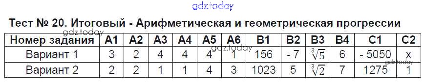 Ответы к Решение к тестам Тест №20. Итоговый - Арифметическая и геометрическая прогрессии Контрольно-измерительным материалам (КИМ) по Алгебре для 9 класса Мартышова ВАКО 2015