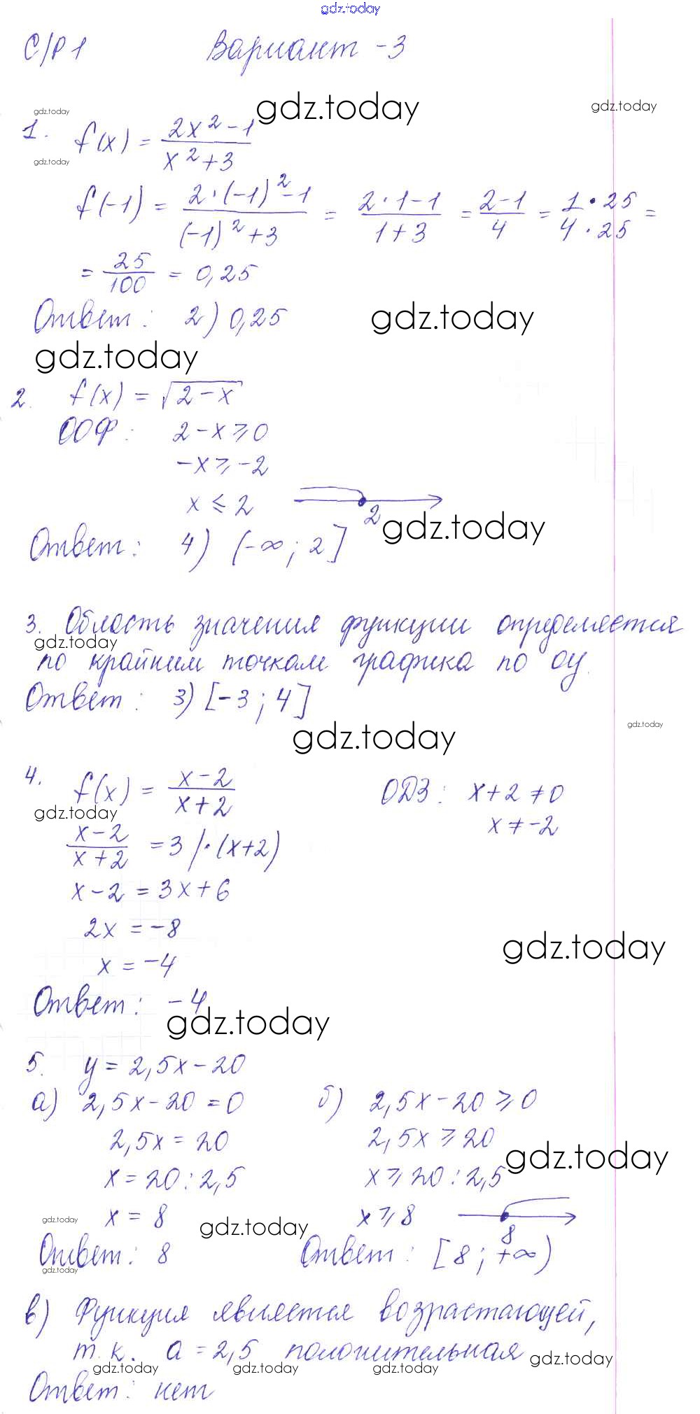 На страницах сайта gdz.today вы найдете учебный и вспомогательный материал, направленный на улучшения знаний школьной программы. ГДЗ - онлайн мир знаний СР-1. Функции и их свойства Решение к самостоятельным работам вариант 3 Самостоятельным и контрольным работам по Алгебре для 9 класса Глазков, Варшавский Экзамен УМК 2013