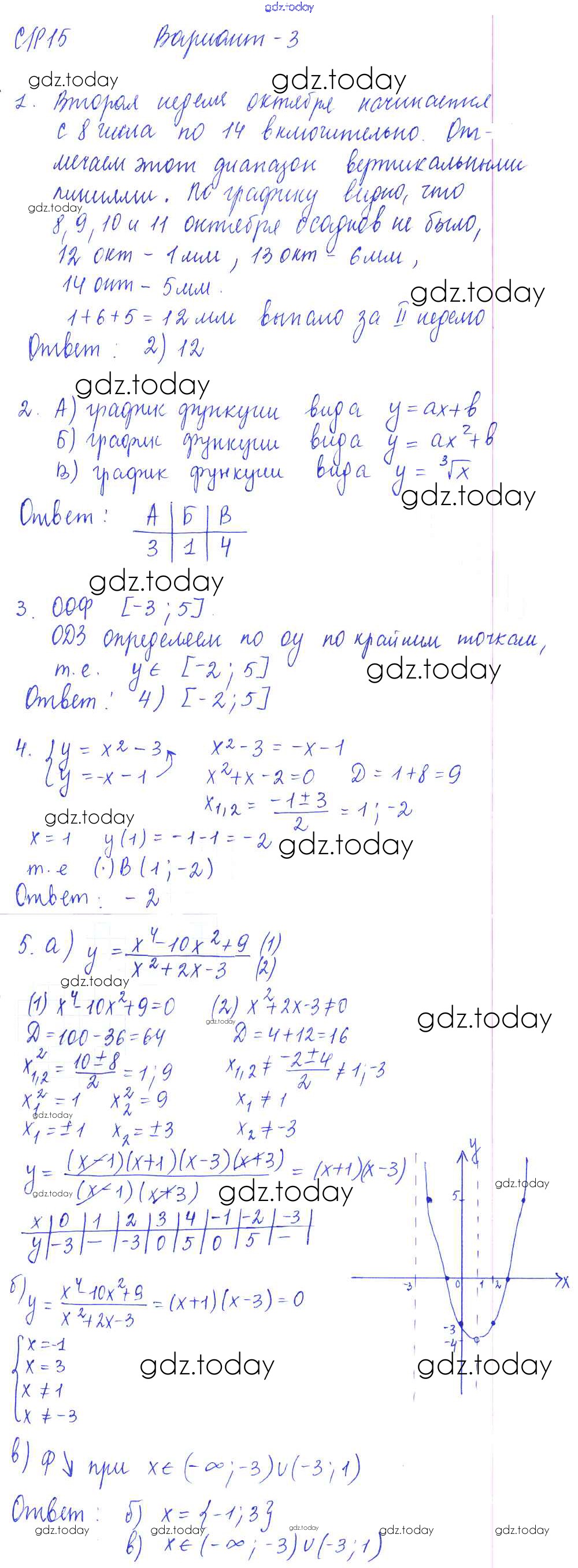 Ответы к СР-15. Итоговое повторение. Функции и графики. Графическое решение уравнений и их систем Решение к самостоятельным работам вариант 3 Самостоятельным и контрольным работам по Алгебре для 9 класса Глазков, Варшавский Экзамен УМК 2013