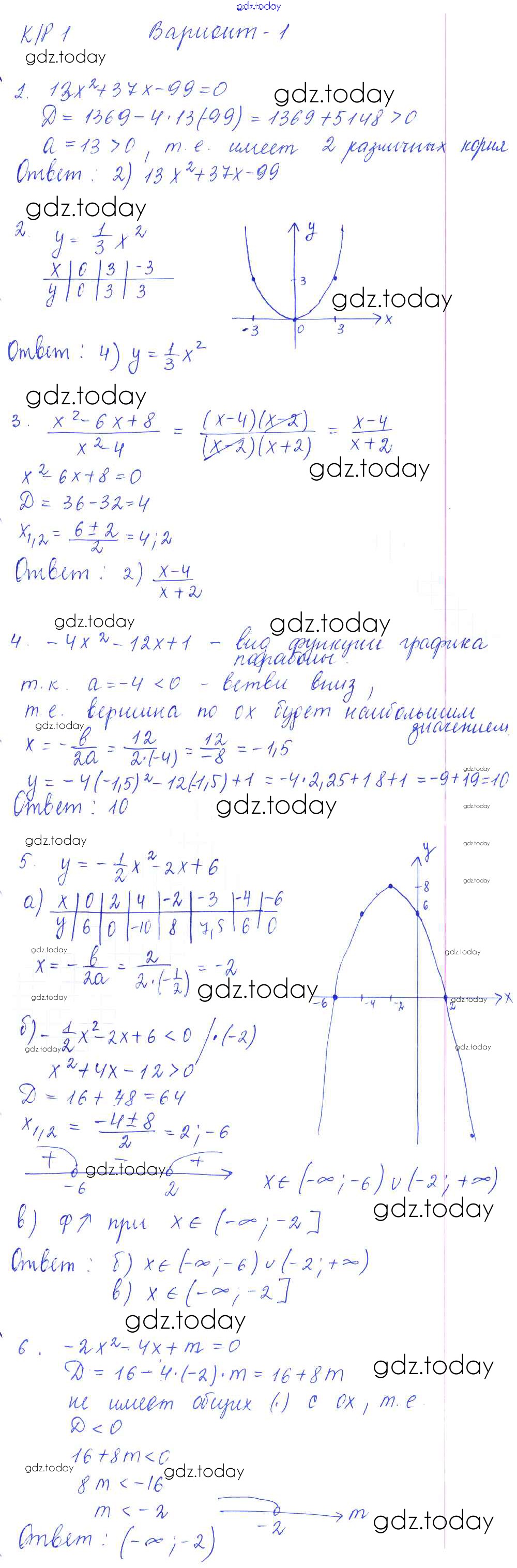 На страницах сайта gdz.today вы найдете учебный и вспомогательный материал, направленный на улучшения знаний школьной программы. ГДЗ - онлайн мир знаний КР-1. Функции и их свойства. Квадратный трехчлен. Квадратичная функция и её график Решение к контрольным работам вариант 1 Самостоятельным и контрольным работам по Алгебре для 9 класса Глазков, Варшавский Экзамен УМК 2013