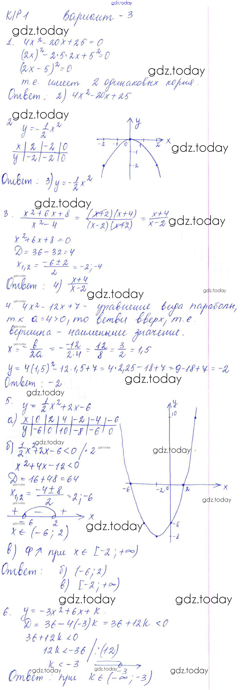 На страницах сайта gdz.today вы найдете учебный и вспомогательный материал, направленный на улучшения знаний школьной программы. ГДЗ - онлайн мир знаний КР-1. Функции и их свойства. Квадратный трехчлен. Квадратичная функция и её график Решение к контрольным работам вариант 3 Самостоятельным и контрольным работам по Алгебре для 9 класса Глазков, Варшавский Экзамен УМК 2013