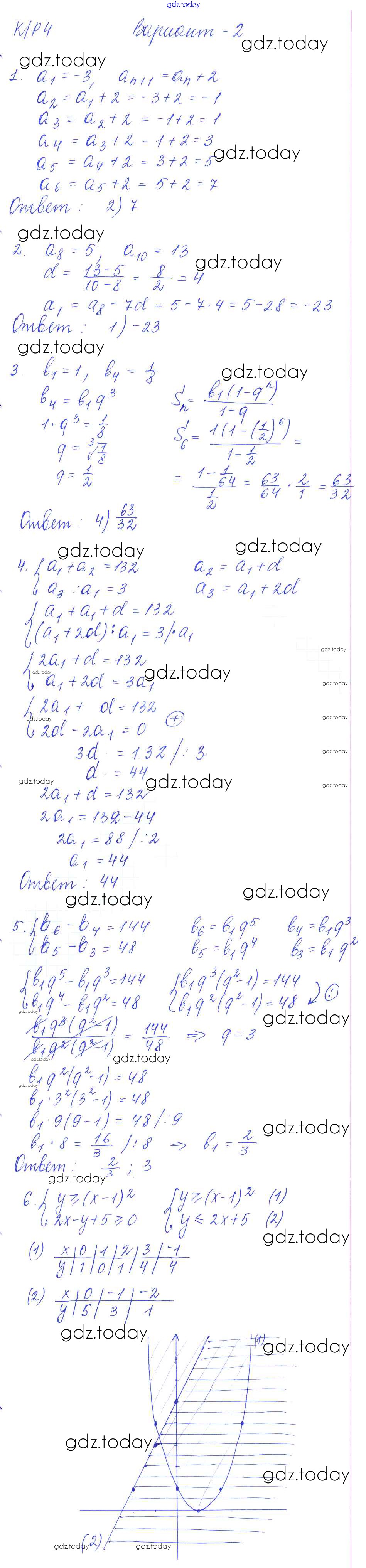 Ответы к КР-4. Неравенства с двумя переменными и их системы. Арифметическая и геометрическая прогрессии Решение к контрольным работам вариант 2 Самостоятельным и контрольным работам по Алгебре для 9 класса Глазков, Варшавский Экзамен УМК 2013