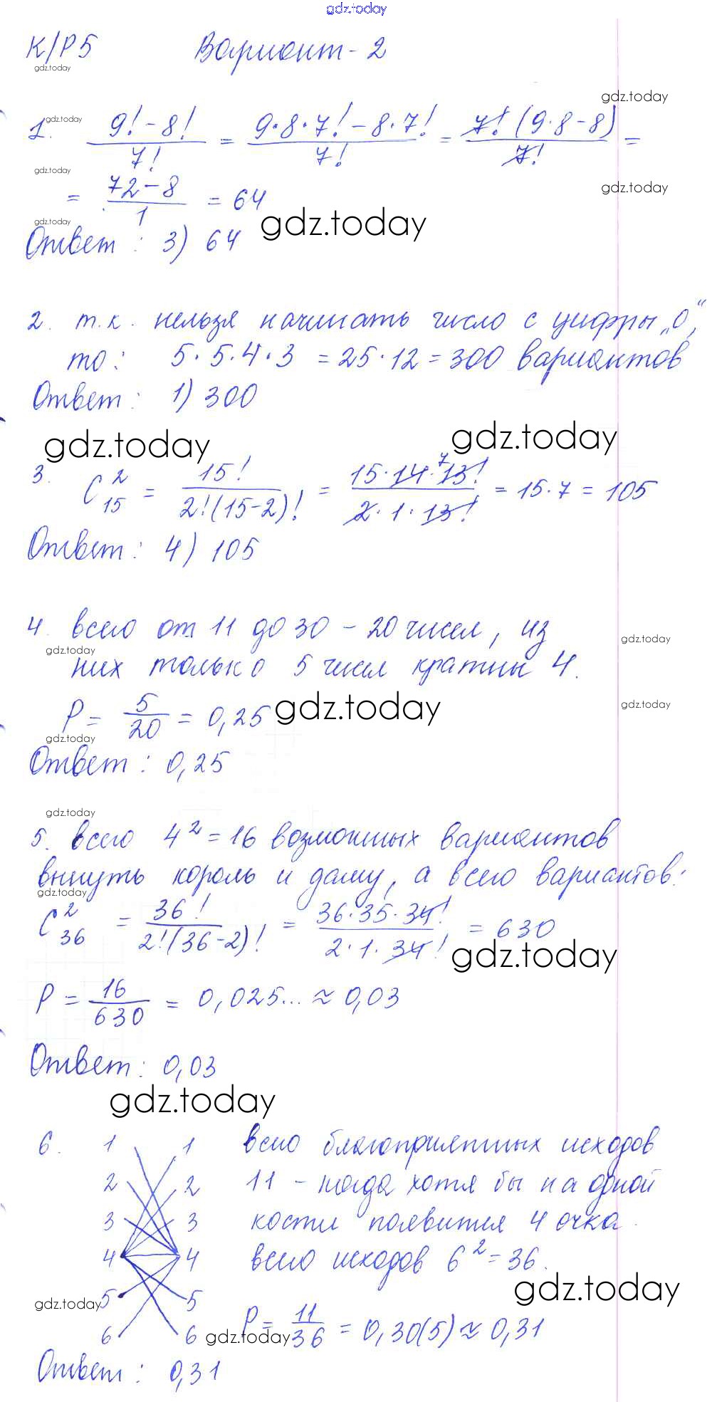 На страницах сайта gdz.today вы найдете учебный и вспомогательный материал, направленный на улучшения знаний школьной программы. ГДЗ - онлайн мир знаний КР-5. Элементы комбинаторики и теории вероятностей Решение к контрольным работам вариант 2 Самостоятельным и контрольным работам по Алгебре для 9 класса Глазков, Варшавский Экзамен УМК 2013