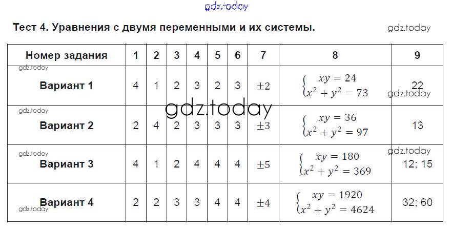 На страницах сайта gdz.today вы найдете учебный и вспомогательный материал, направленный на улучшения знаний школьной программы. ГДЗ - онлайн мир знаний Решение к тестам Тест 4. Уравнения с двумя переменными и их системы Тематическим тестам по Алгебре для 9 класса Дудницын, Кронгауз Просвещение 2017