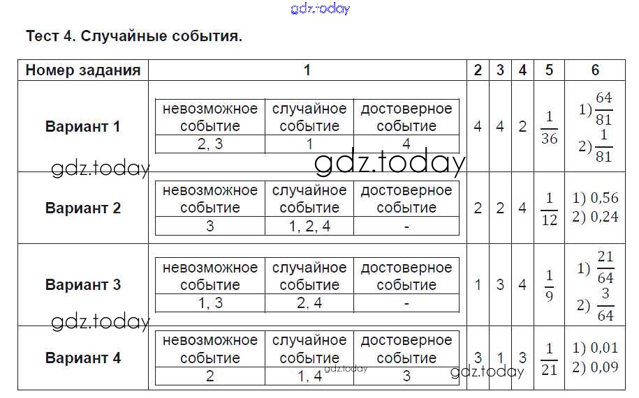На страницах сайта gdz.today вы найдете учебный и вспомогательный материал, направленный на улучшения знаний школьной программы. ГДЗ - онлайн мир знаний Решение к тестам Тест № 4. Случайные события Тематическим тестам по Алгебре для 9 класса Ткачева Просвещение 2014