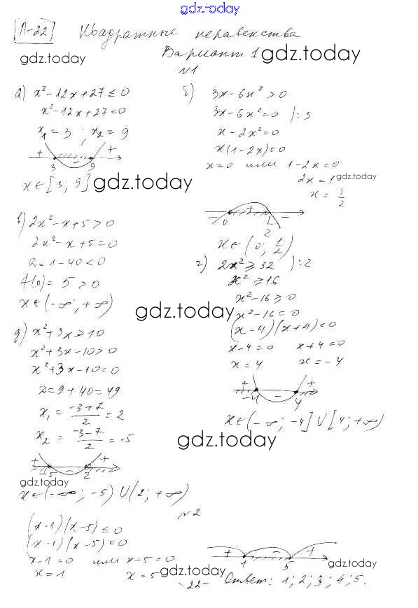 На страницах сайта gdz.today вы найдете учебный и вспомогательный материал, направленный на улучшения знаний школьной программы. ГДЗ - онлайн мир знаний П-22. Квадратные неравенства Решение к проверочным работам Вариант 1 Дидактическим материалам по Алгебре для 9 класса Евстафьева, Карп Просвещение 2017