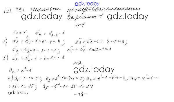 На страницах сайта gdz.today вы найдете учебный и вспомогательный материал, направленный на улучшения знаний школьной программы. ГДЗ - онлайн мир знаний П-42. Числовые последовательности Решение к проверочным работам Вариант 1 Дидактическим материалам по Алгебре для 9 класса Евстафьева, Карп Просвещение 2017