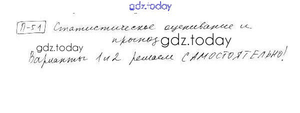 На страницах сайта gdz.today вы найдете учебный и вспомогательный материал, направленный на улучшения знаний школьной программы. ГДЗ - онлайн мир знаний П-51. Статистическое оценивание и прогноз Решение к проверочным работам Вариант 1-2 Дидактическим материалам по Алгебре для 9 класса Евстафьева, Карп Просвещение 2017