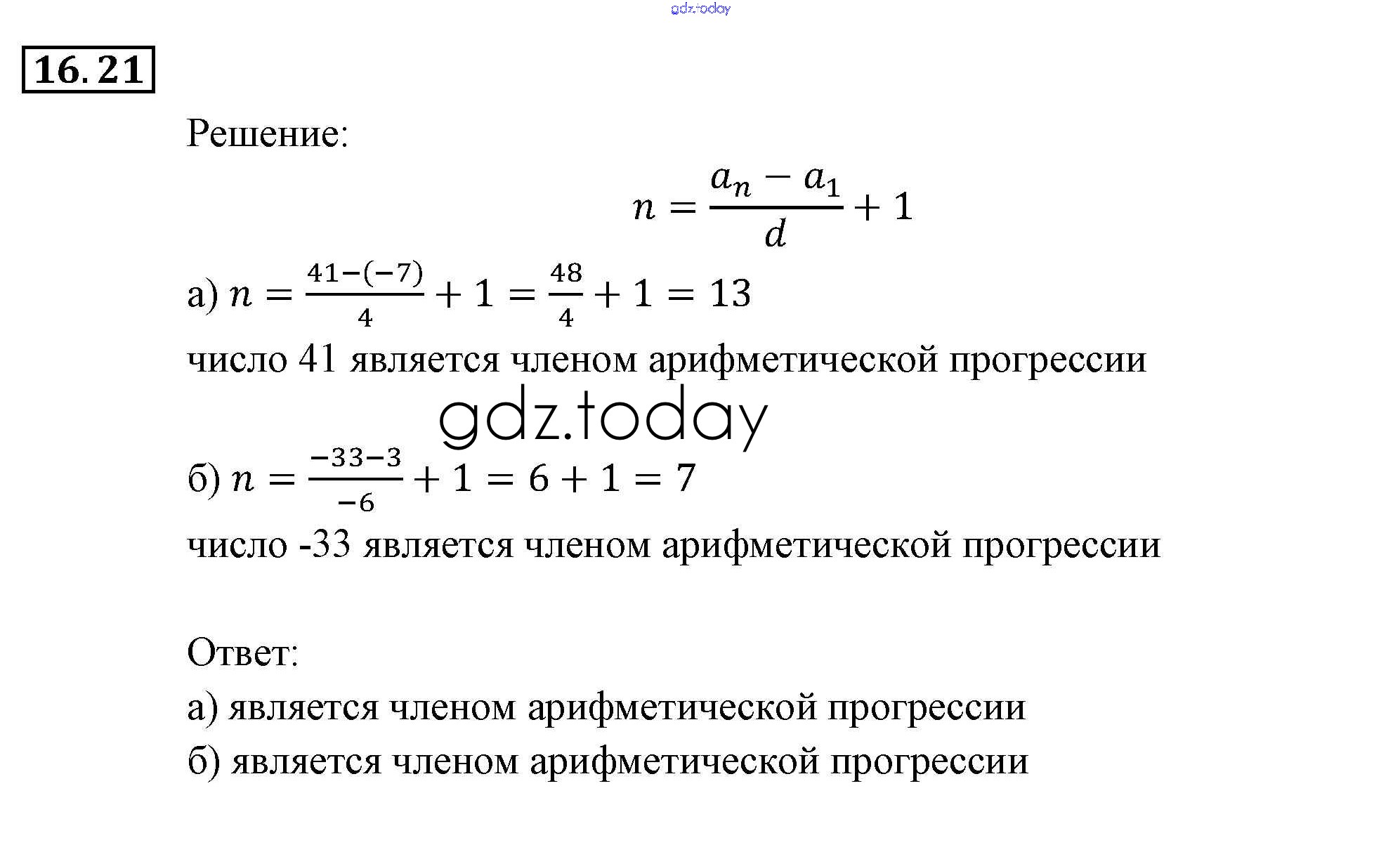 На страницах сайта gdz.today вы найдете учебный и вспомогательный материал, направленный на улучшения знаний школьной программы. ГДЗ - онлайн мир знаний § 16. Арифметическая прогрессия Глава 4. Прогрессии 21 Задачнику по Алгебре для 9 класса Мордкович, Александрова Мнемозина 2010
