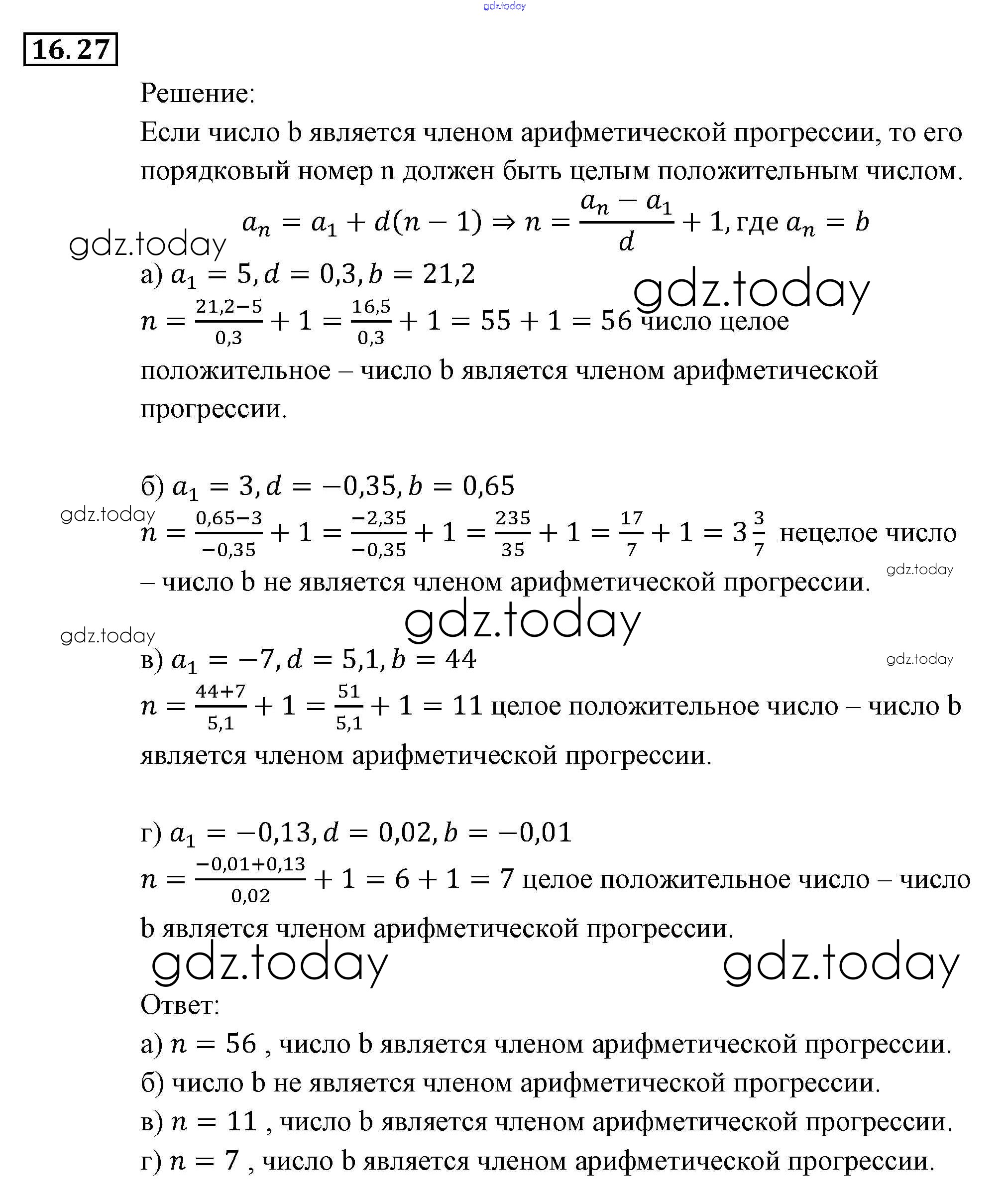 На страницах сайта gdz.today вы найдете учебный и вспомогательный материал, направленный на улучшения знаний школьной программы. ГДЗ - онлайн мир знаний § 16. Арифметическая прогрессия Глава 4. Прогрессии 27 Задачнику по Алгебре для 9 класса Мордкович, Александрова Мнемозина 2010