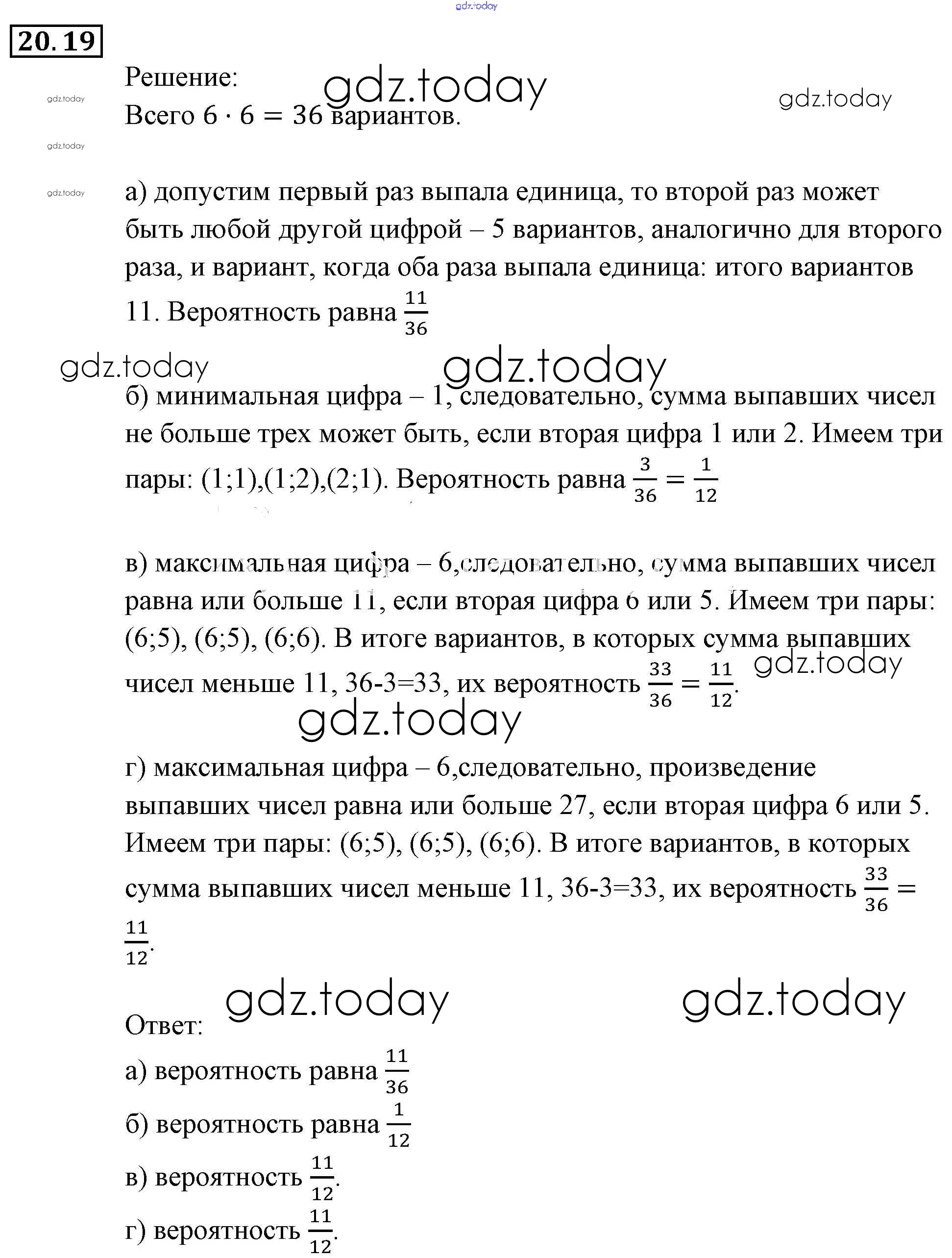 Ответы к § 20. Простейшие вероятностные задачи Глава 5. Элементы комбинаторики, статистики и теории вероятностей 19 Задачнику по Алгебре для 9 класса Мордкович, Александрова Мнемозина 2010