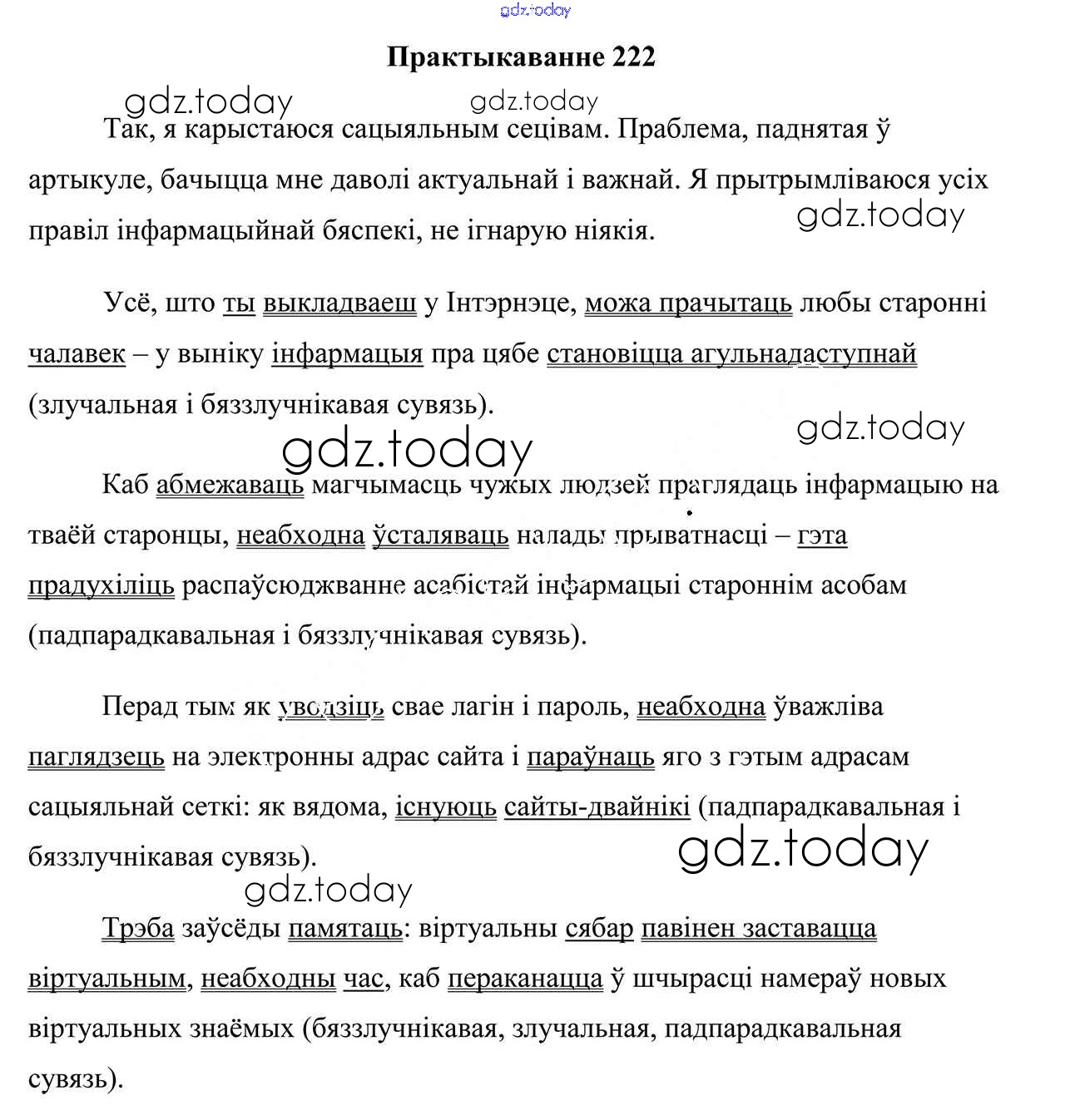 На страницах сайта gdz.today вы найдете учебный и вспомогательный материал, направленный на улучшения знаний школьной программы. ГДЗ - онлайн мир знаний Рашальнік да практыкаванняў 222 Учебнику по Белорусскому языку для 9 класса Валочка, Васюковіч Национальный институт образования 2019