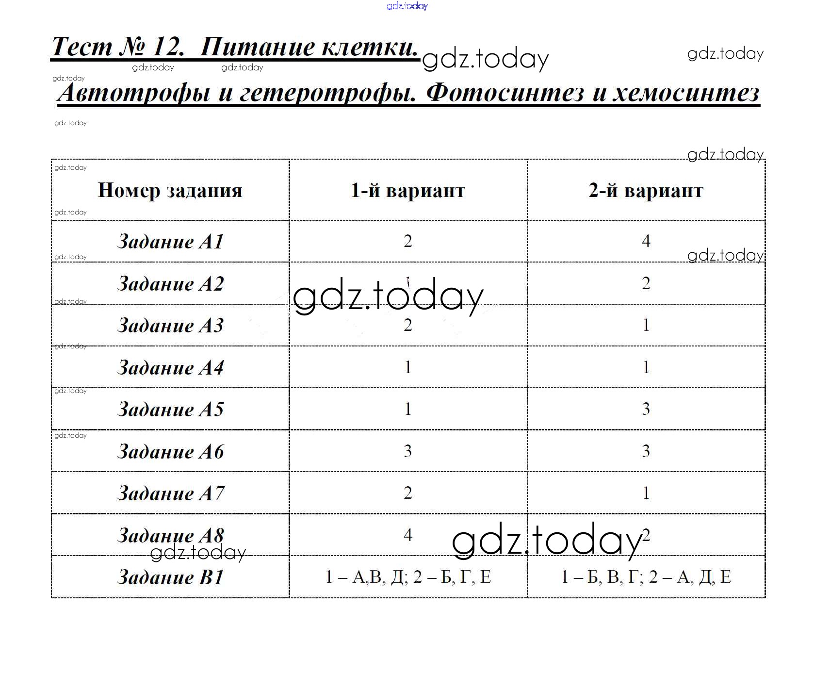 Ответы к Решение к тестам Тест №12. Питание клетки. Автотрофы и гетеротрофы. Фотосинтез и хемосинтез Контрольно-измерительным материалам (КИМ) по Биологии для 9 класса Богданов ВАКО 2017