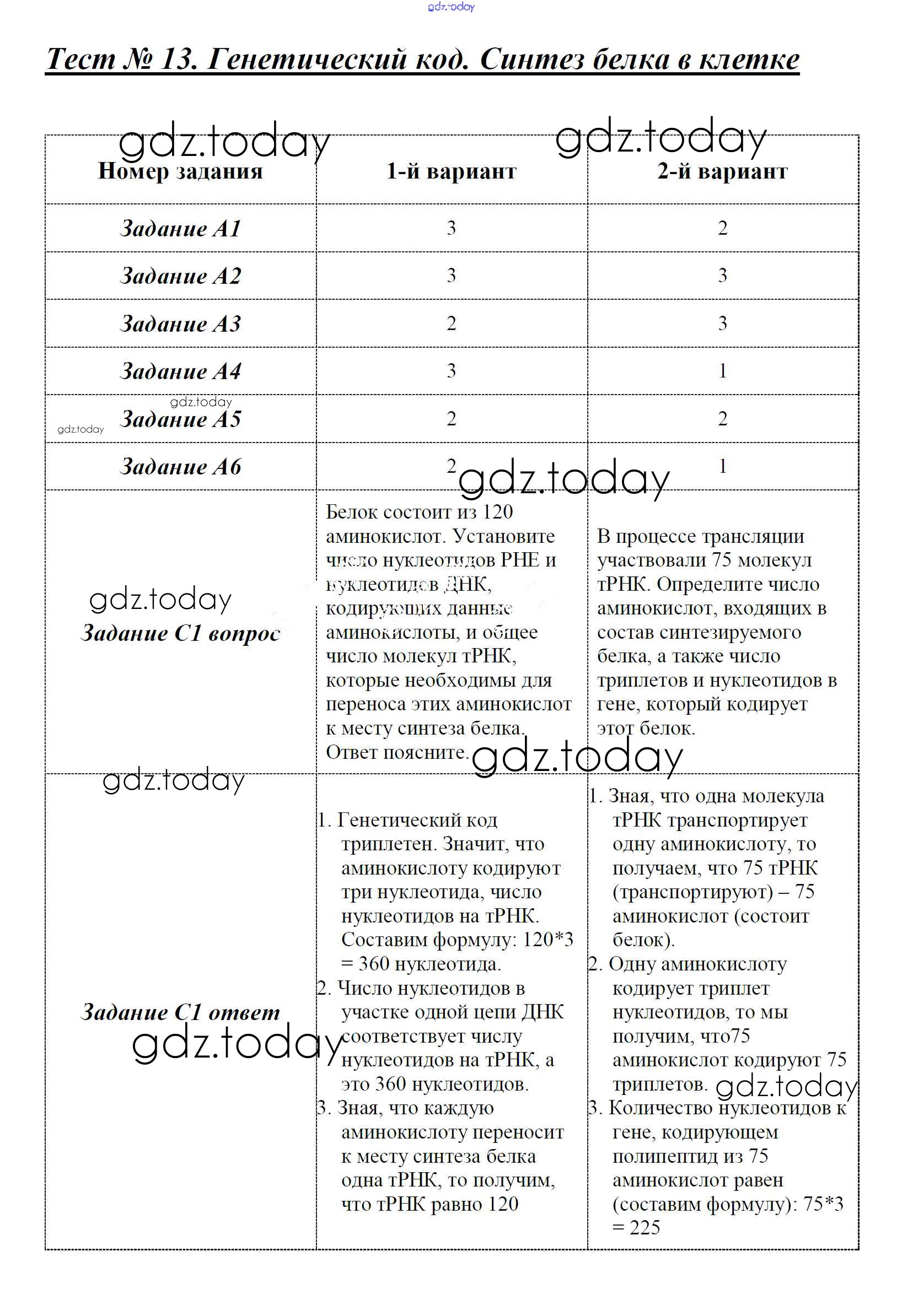 Ответы к Решение к тестам Тест №13. Генетический код. Синтез белка в клетке Контрольно-измерительным материалам (КИМ) по Биологии для 9 класса Богданов ВАКО 2017
