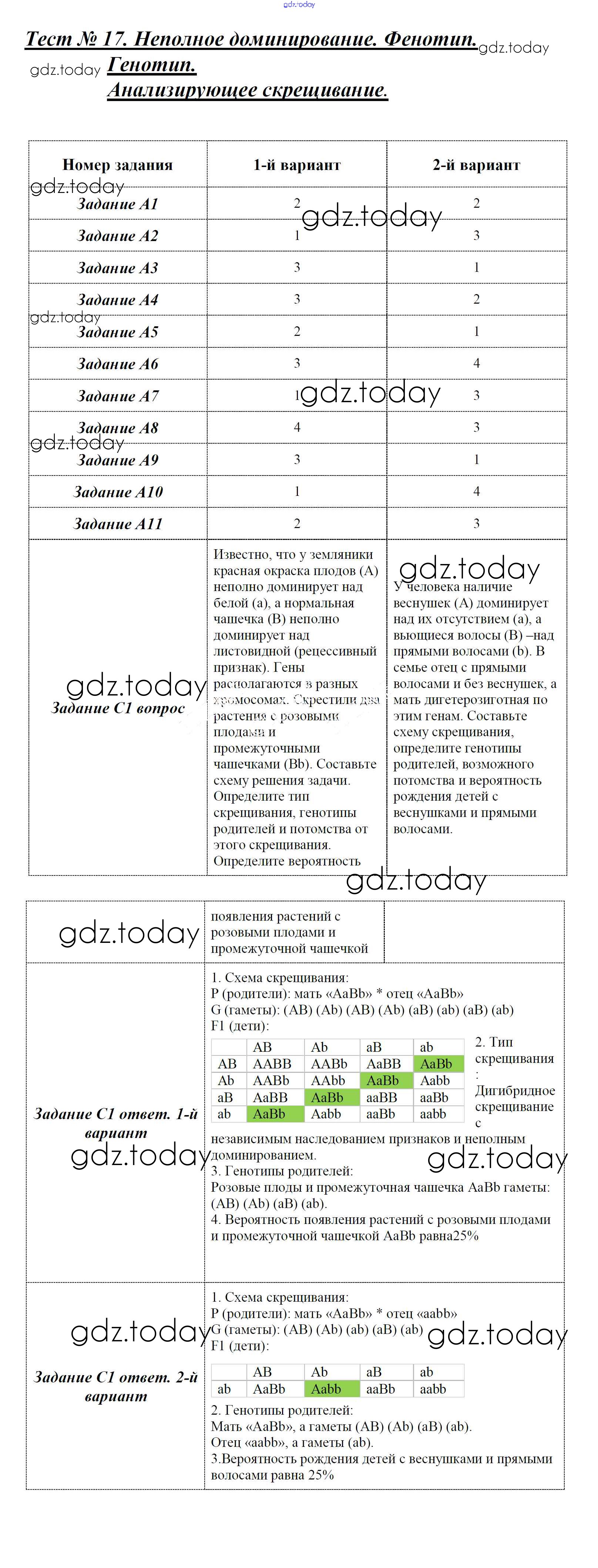 Ответы к Решение к тестам Тест №17. Неполное доминирование. Фенотип. Генотип. Анализирующее скрещивание Контрольно-измерительным материалам (КИМ) по Биологии для 9 класса Богданов ВАКО 2017