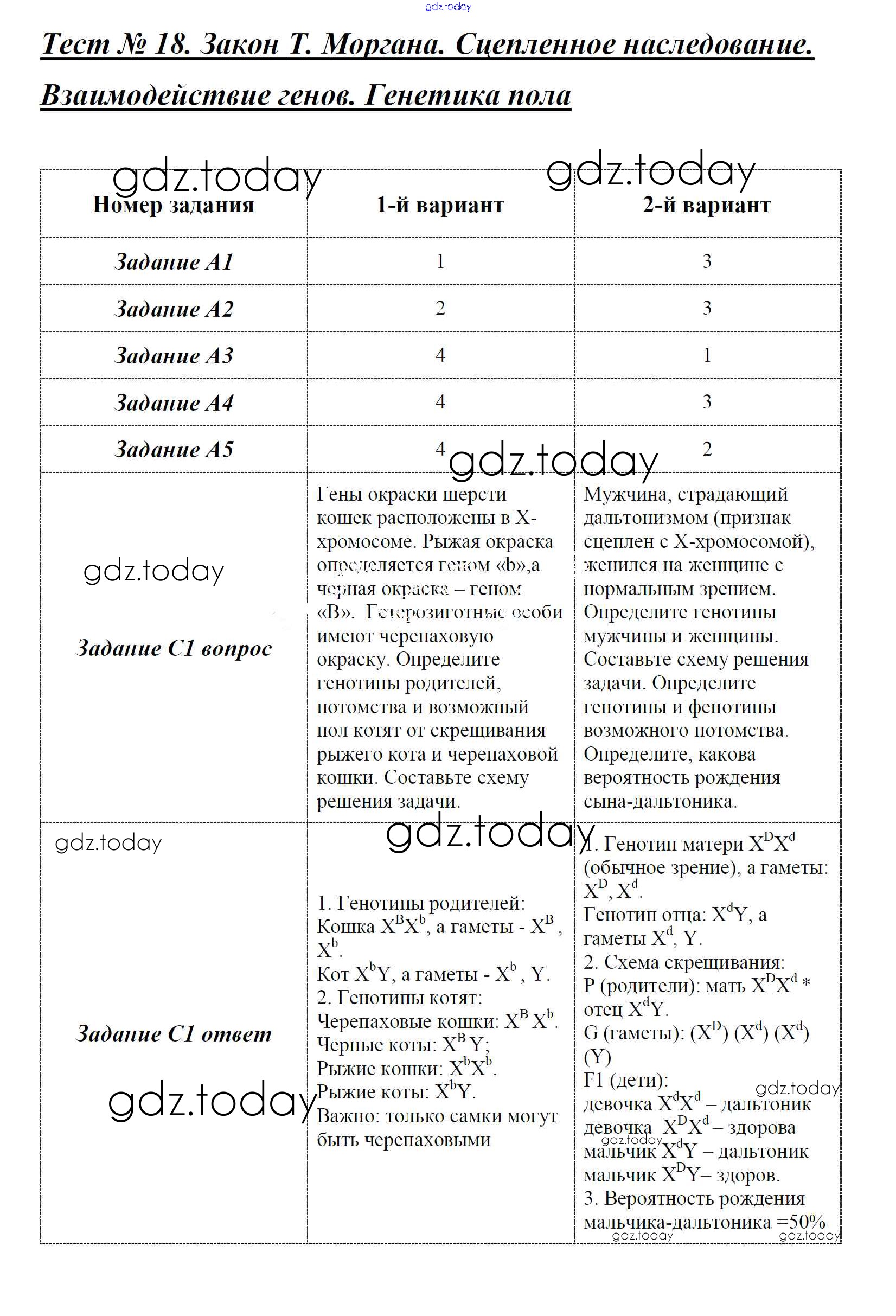 Ответы к Решение к тестам Тест №18. Закон Т. Моргана. Сцепленное наследование. Взаимодействие генов. Генетика пола Контрольно-измерительным материалам (КИМ) по Биологии для 9 класса Богданов ВАКО 2017