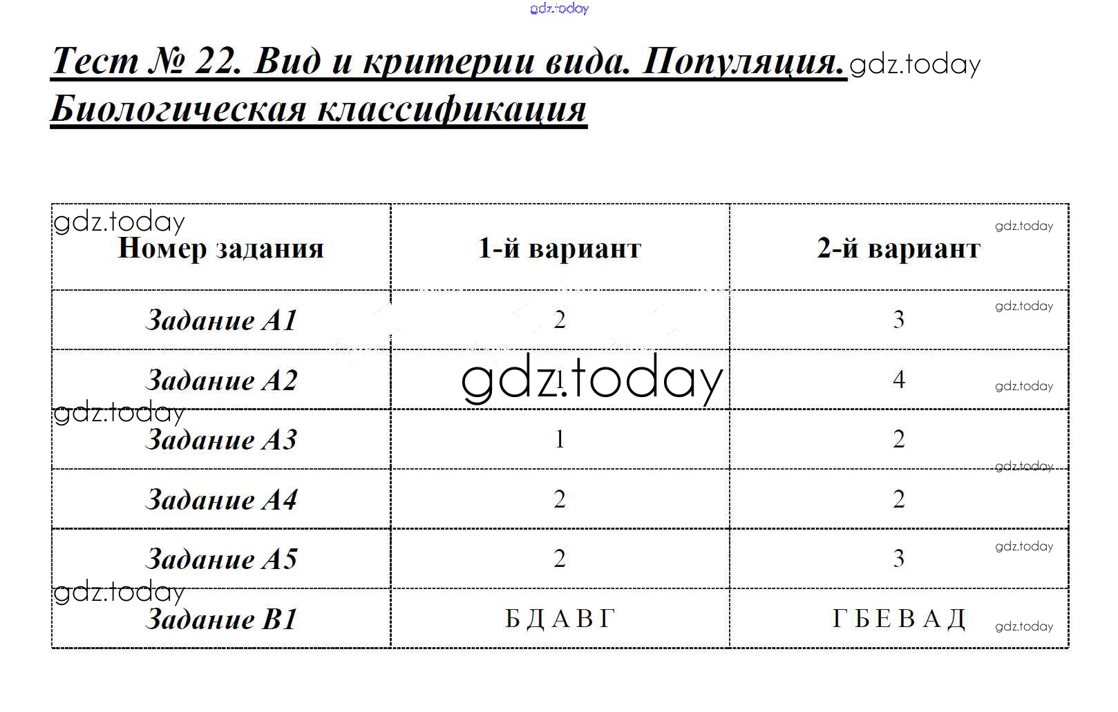 На страницах сайта gdz.today вы найдете учебный и вспомогательный материал, направленный на улучшения знаний школьной программы. ГДЗ - онлайн мир знаний Решение к тестам Тест №22. Вид и критерии вида. Популяция. Биологическая классификация Контрольно-измерительным материалам (КИМ) по Биологии для 9 класса Богданов ВАКО 2017