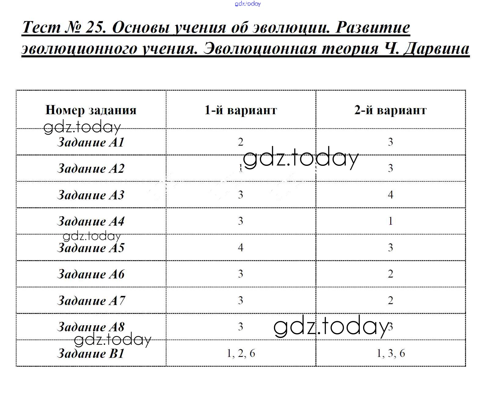 На страницах сайта gdz.today вы найдете учебный и вспомогательный материал, направленный на улучшения знаний школьной программы. ГДЗ - онлайн мир знаний Решение к тестам Тест №25. Основы учения об эволюции. Эволюционная теория Ч. Дарвина Контрольно-измерительным материалам (КИМ) по Биологии для 9 класса Богданов ВАКО 2017