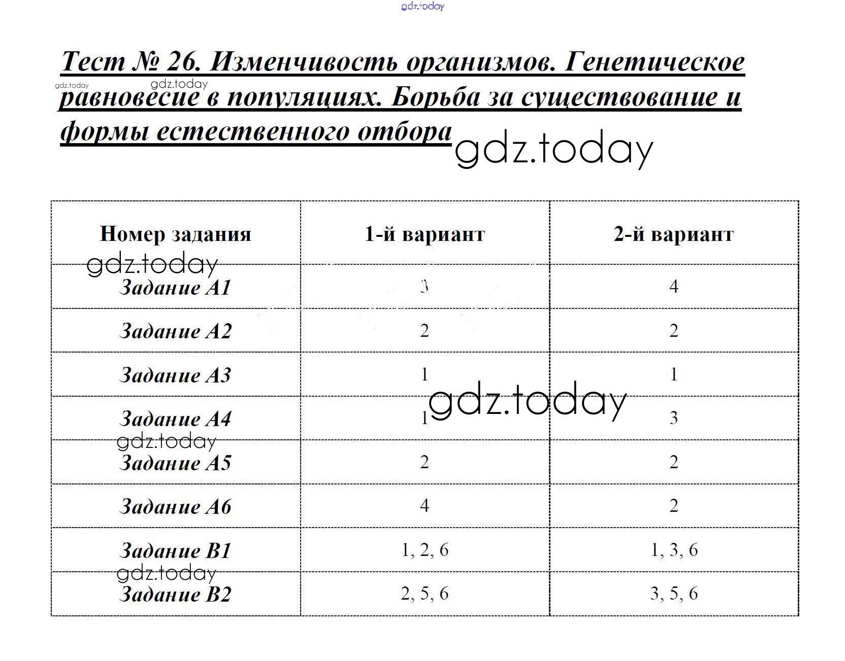 Ответы к Решение к тестам Тест №26. Изменчивость организмов. Генетическое равновесие в популяциях Контрольно-измерительным материалам (КИМ) по Биологии для 9 класса Богданов ВАКО 2017