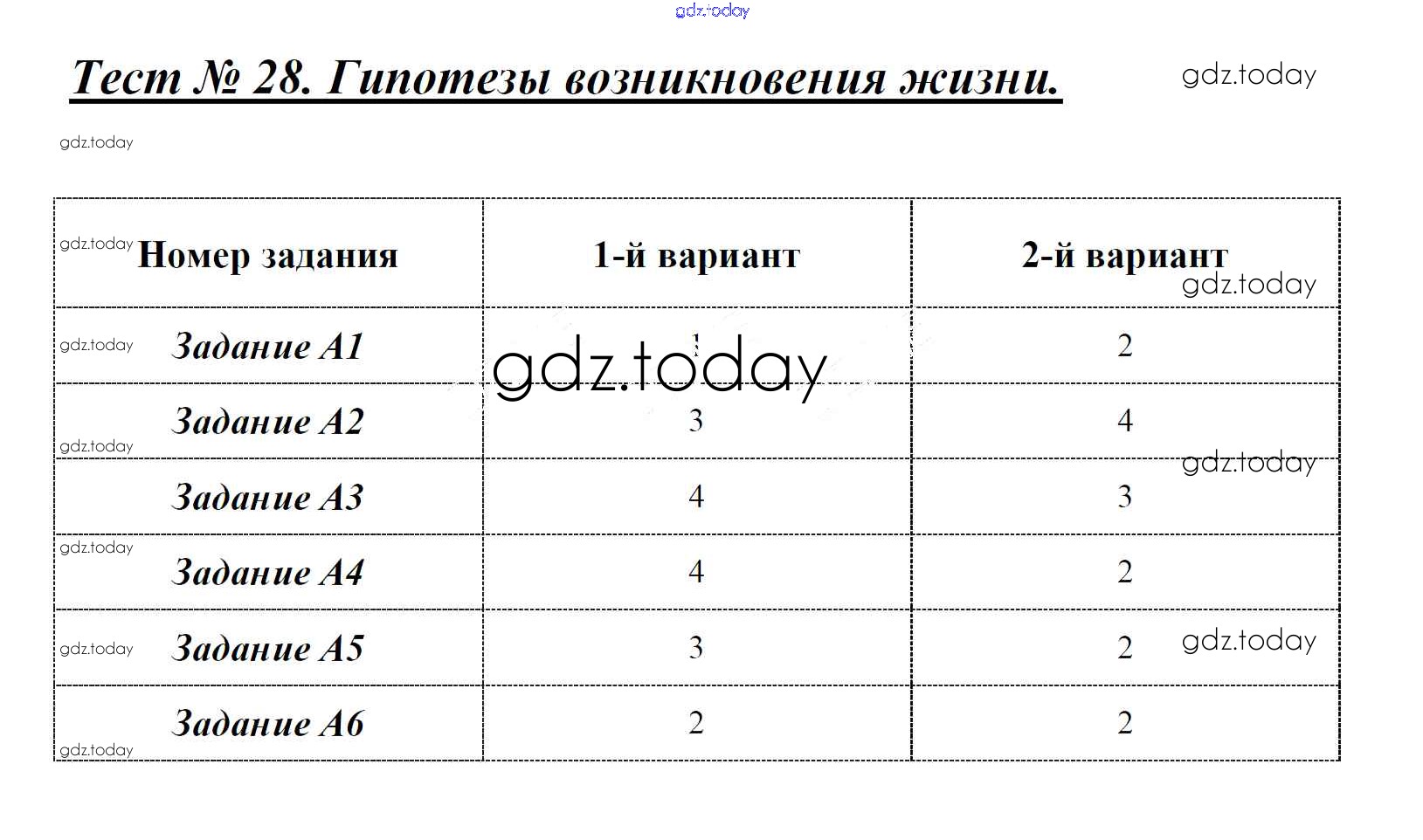 На страницах сайта gdz.today вы найдете учебный и вспомогательный материал, направленный на улучшения знаний школьной программы. ГДЗ - онлайн мир знаний Решение к тестам Тест №28. Гипотезы возникновения жизни Контрольно-измерительным материалам (КИМ) по Биологии для 9 класса Богданов ВАКО 2017