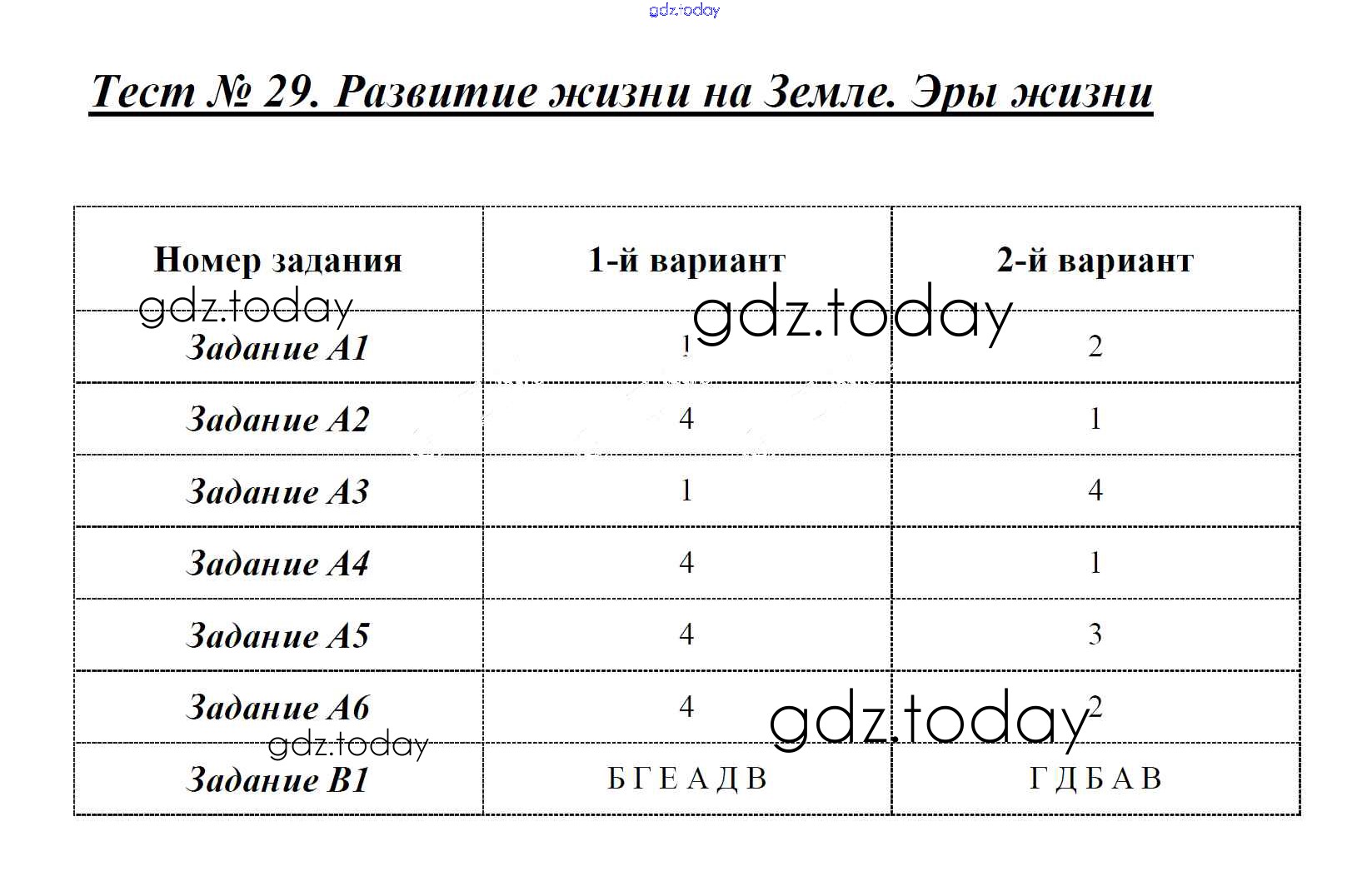 Ответы к Решение к тестам Тест №29. Развитие жизни на Земле. Эры жизни Контрольно-измерительным материалам (КИМ) по Биологии для 9 класса Богданов ВАКО 2017