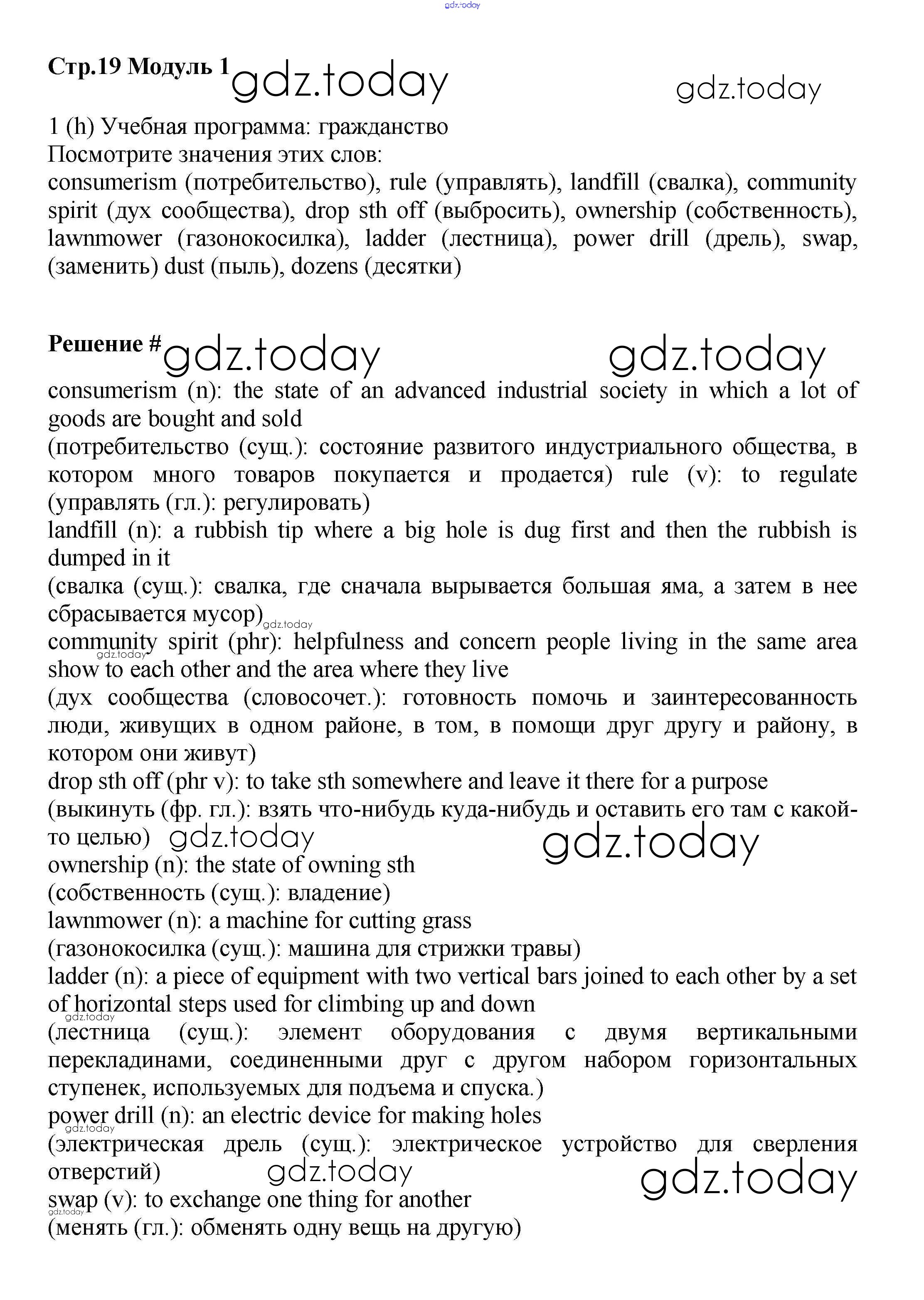 На страницах сайта gdz.today вы найдете учебный и вспомогательный материал, направленный на улучшения знаний школьной программы. ГДЗ - онлайн мир знаний Решение к Module 1. Lifestyles стр.19 Учебнику по Английскому языку для 9 класса Баранова, Дули Углубленный уровень Просвещение Starlight 2017