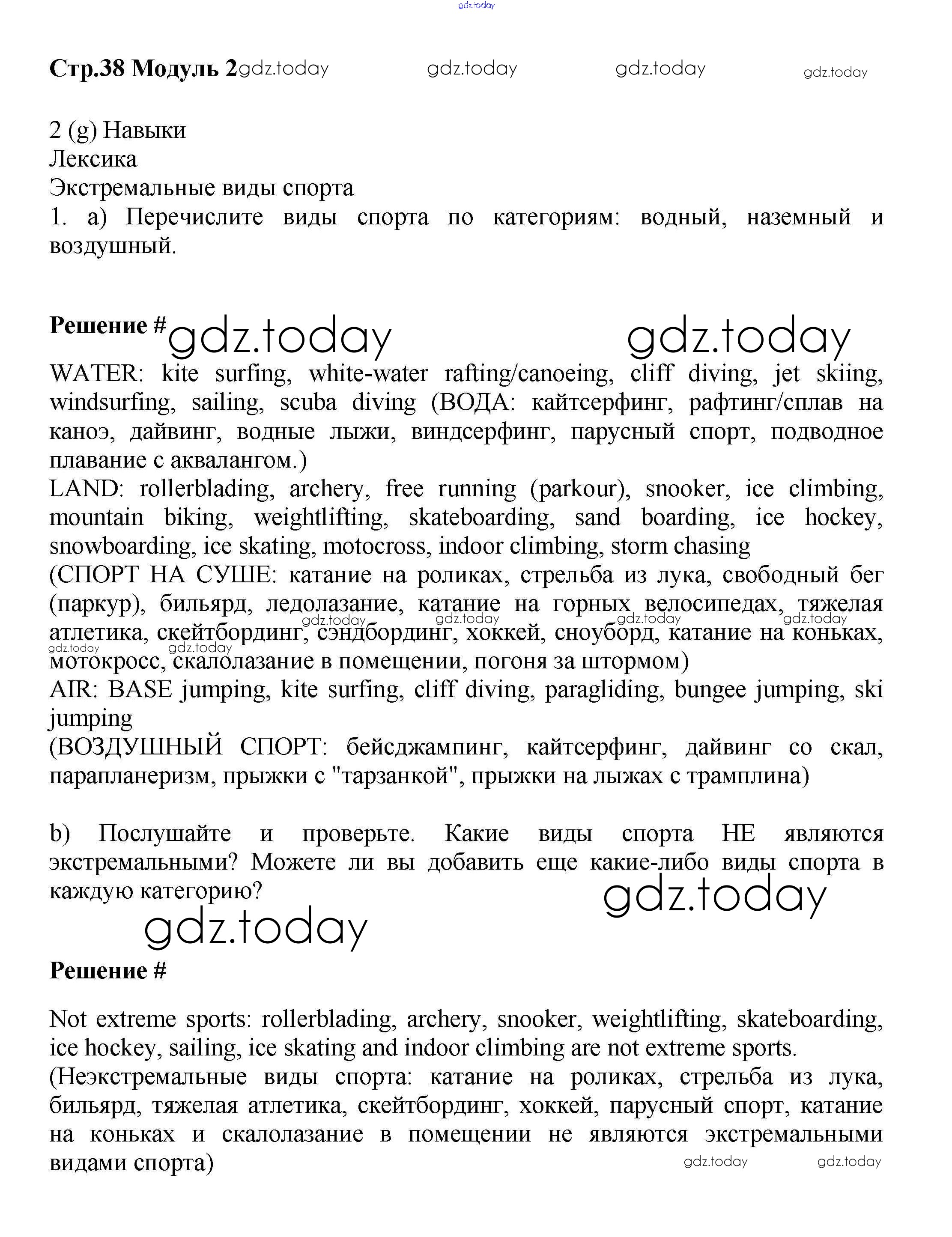 На страницах сайта gdz.today вы найдете учебный и вспомогательный материал, направленный на улучшения знаний школьной программы. ГДЗ - онлайн мир знаний Решение к Module 2. Extreme facts стр.38 Учебнику по Английскому языку для 9 класса Баранова, Дули Углубленный уровень Просвещение Starlight 2017