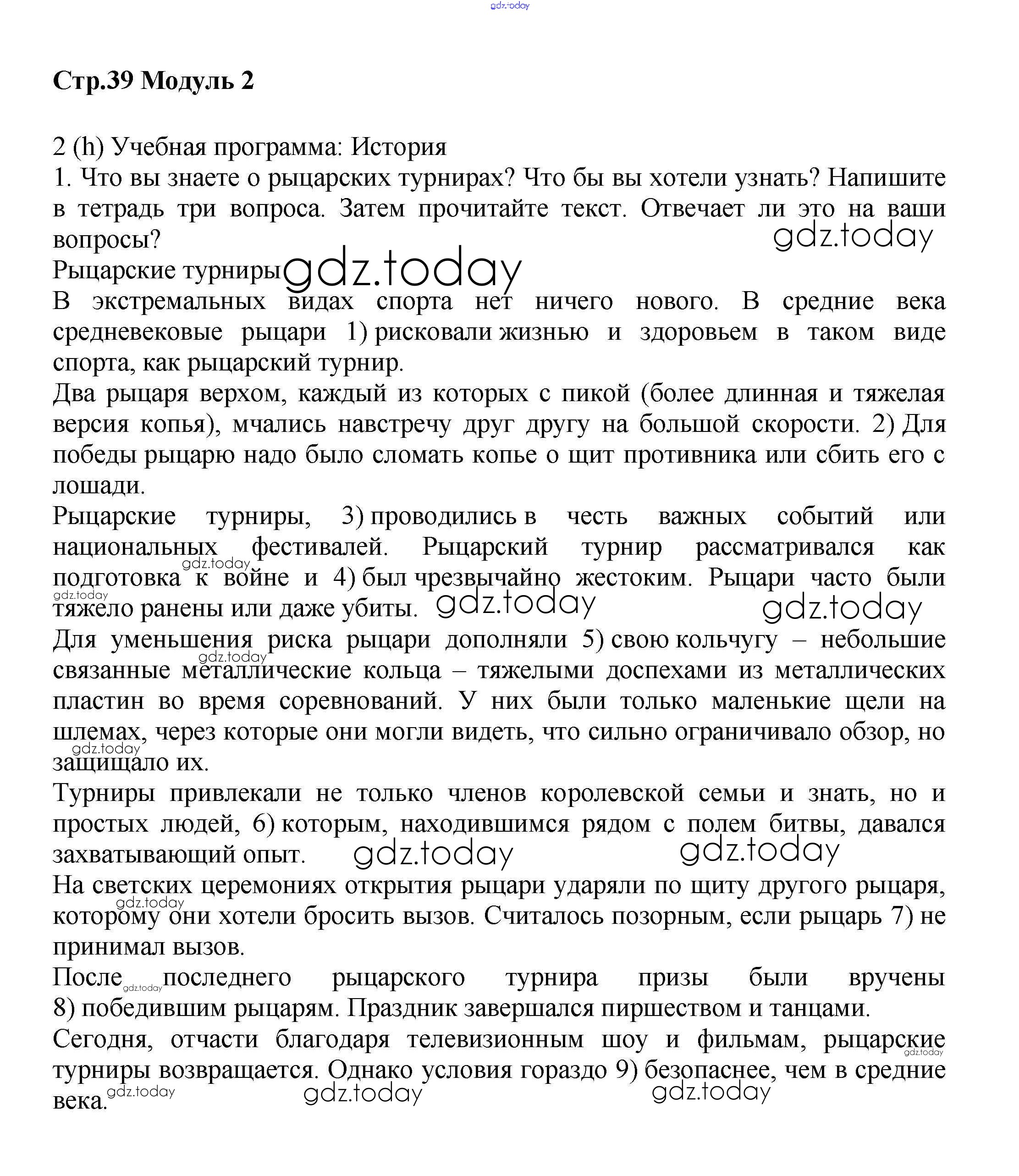 На страницах сайта gdz.today вы найдете учебный и вспомогательный материал, направленный на улучшения знаний школьной программы. ГДЗ - онлайн мир знаний Решение к Module 2. Extreme facts стр.39 Учебнику по Английскому языку для 9 класса Баранова, Дули Углубленный уровень Просвещение Starlight 2017
