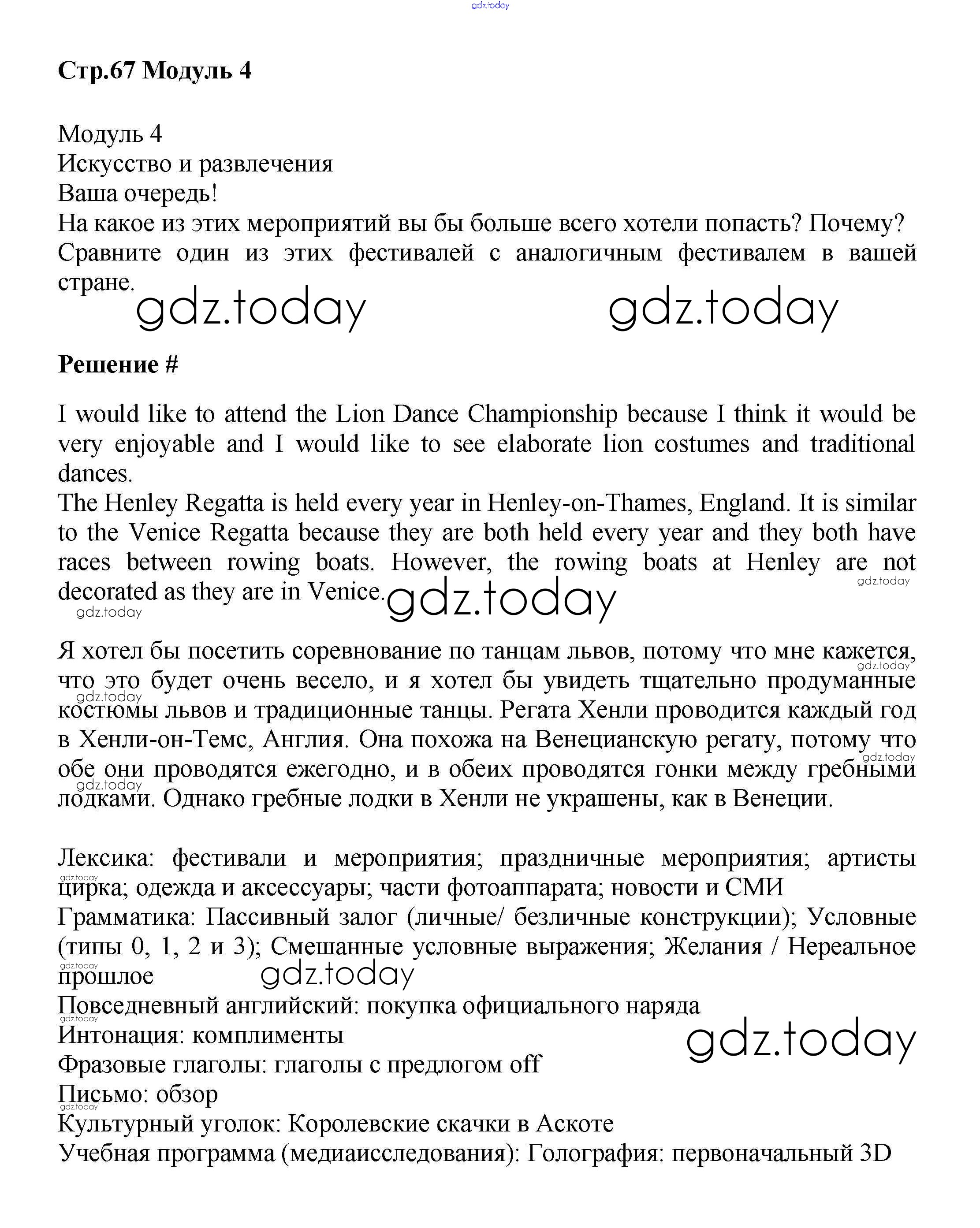 На страницах сайта gdz.today вы найдете учебный и вспомогательный материал, направленный на улучшения знаний школьной программы. ГДЗ - онлайн мир знаний Решение к Module 4. Art & Entertainment стр.67 Учебнику по Английскому языку для 9 класса Баранова, Дули Углубленный уровень Просвещение Starlight 2017