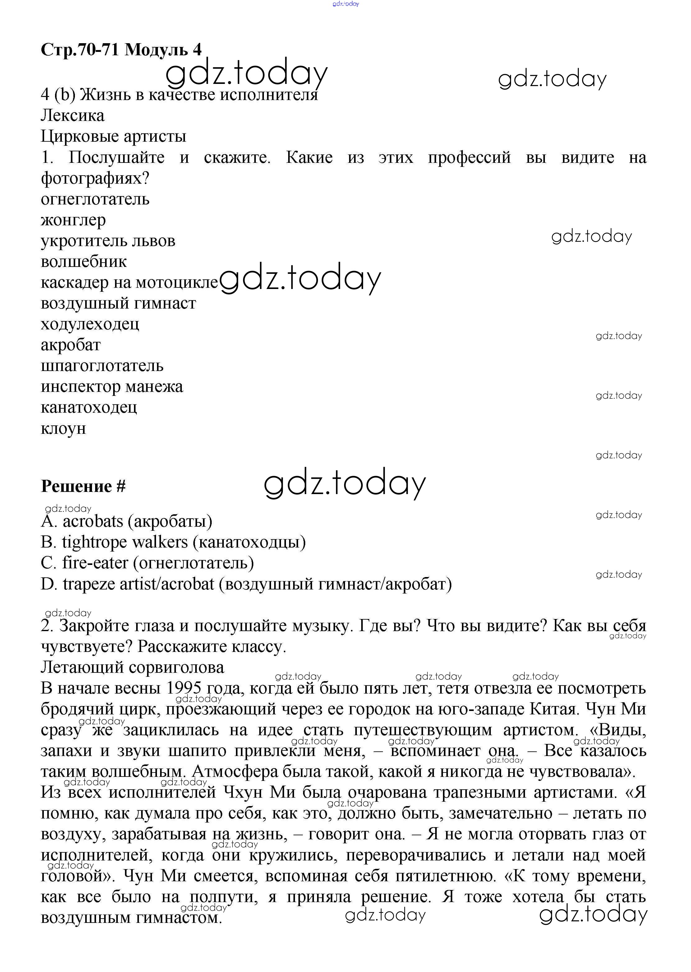 На страницах сайта gdz.today вы найдете учебный и вспомогательный материал, направленный на улучшения знаний школьной программы. ГДЗ - онлайн мир знаний Решение к Module 4. Art & Entertainment стр.70-71 Учебнику по Английскому языку для 9 класса Баранова, Дули Углубленный уровень Просвещение Starlight 2017