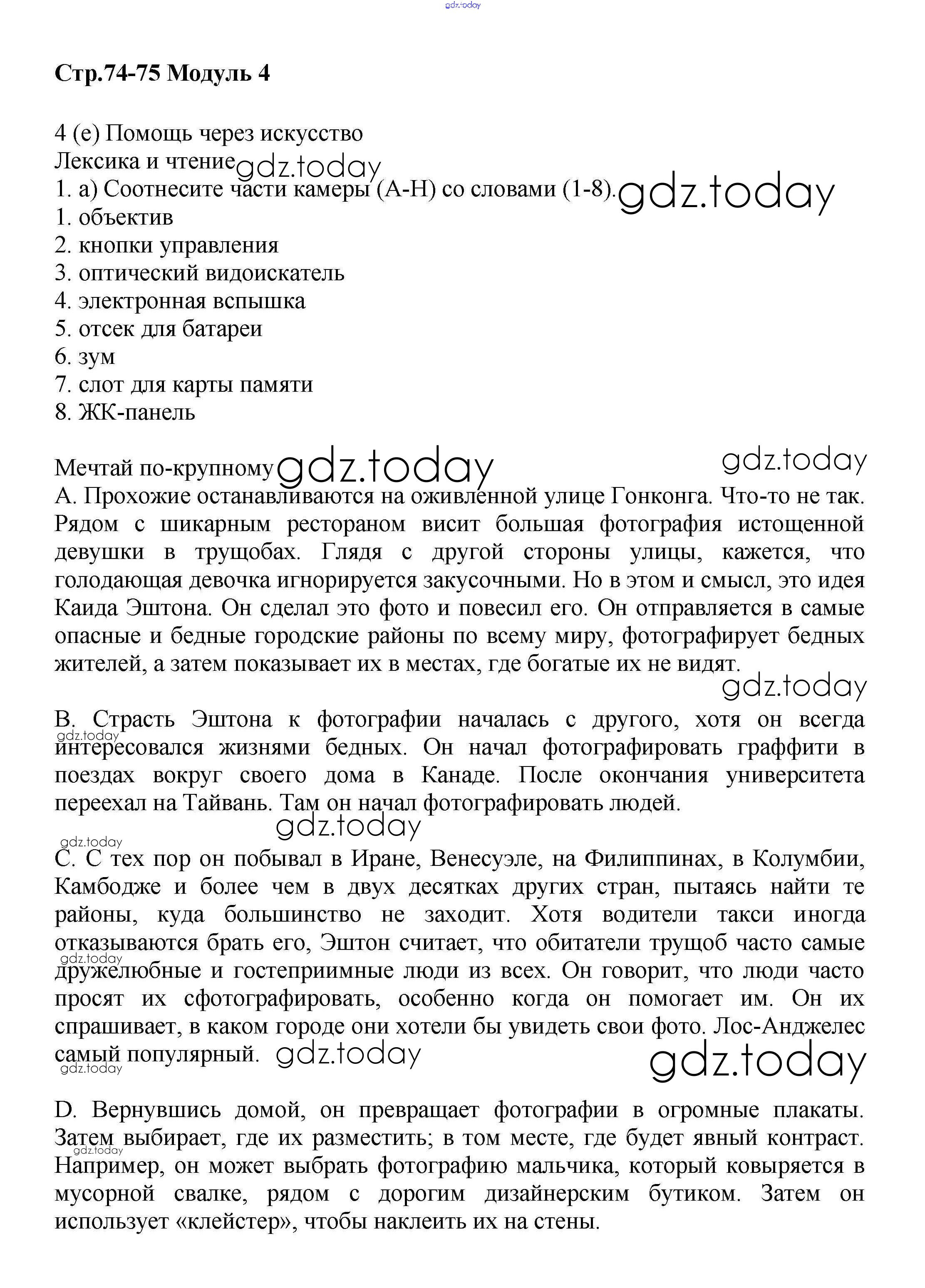 На страницах сайта gdz.today вы найдете учебный и вспомогательный материал, направленный на улучшения знаний школьной программы. ГДЗ - онлайн мир знаний Решение к Module 4. Art & Entertainment стр.74-75 Учебнику по Английскому языку для 9 класса Баранова, Дули Углубленный уровень Просвещение Starlight 2017