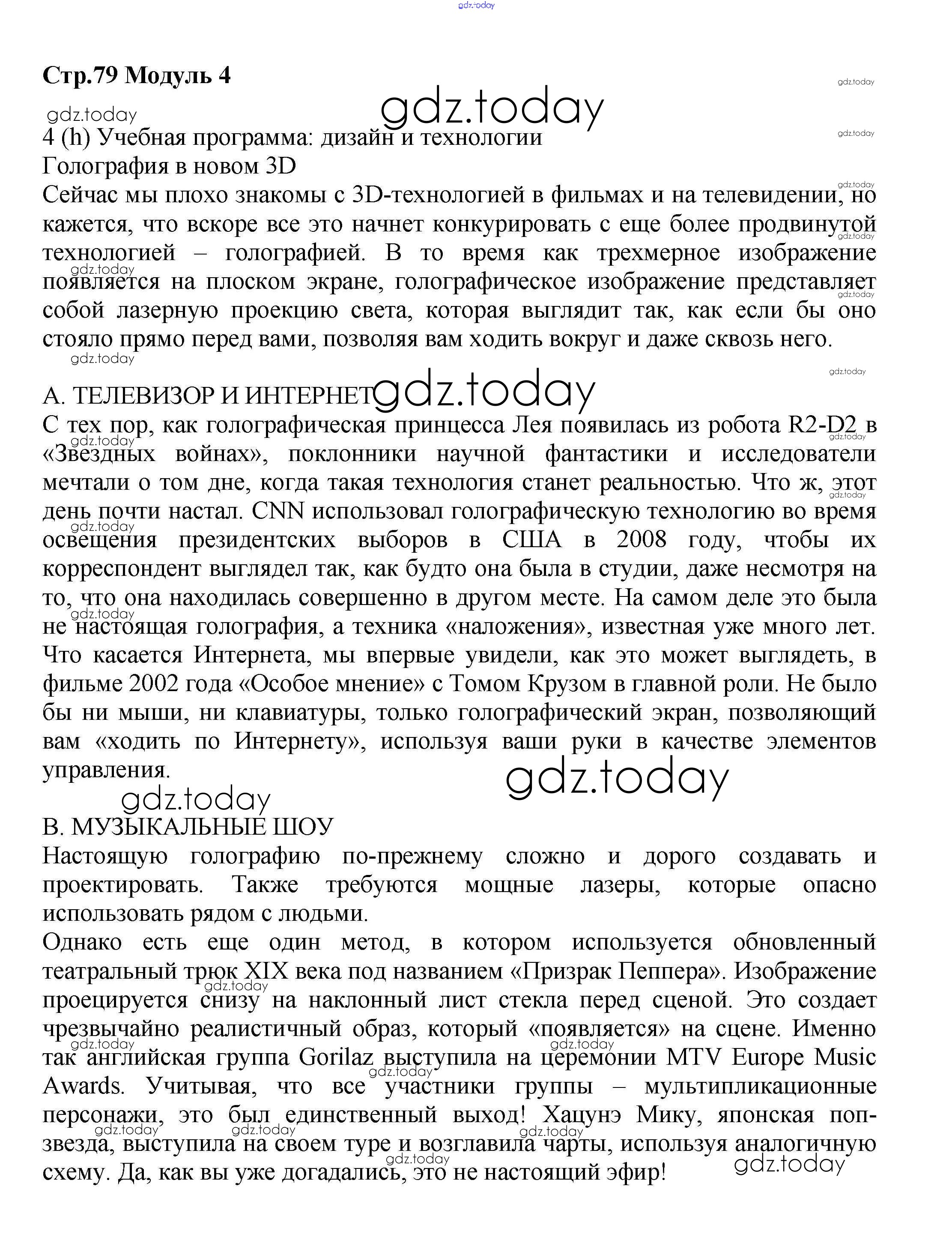 На страницах сайта gdz.today вы найдете учебный и вспомогательный материал, направленный на улучшения знаний школьной программы. ГДЗ - онлайн мир знаний Решение к Module 4. Art & Entertainment стр.79 Учебнику по Английскому языку для 9 класса Баранова, Дули Углубленный уровень Просвещение Starlight 2017