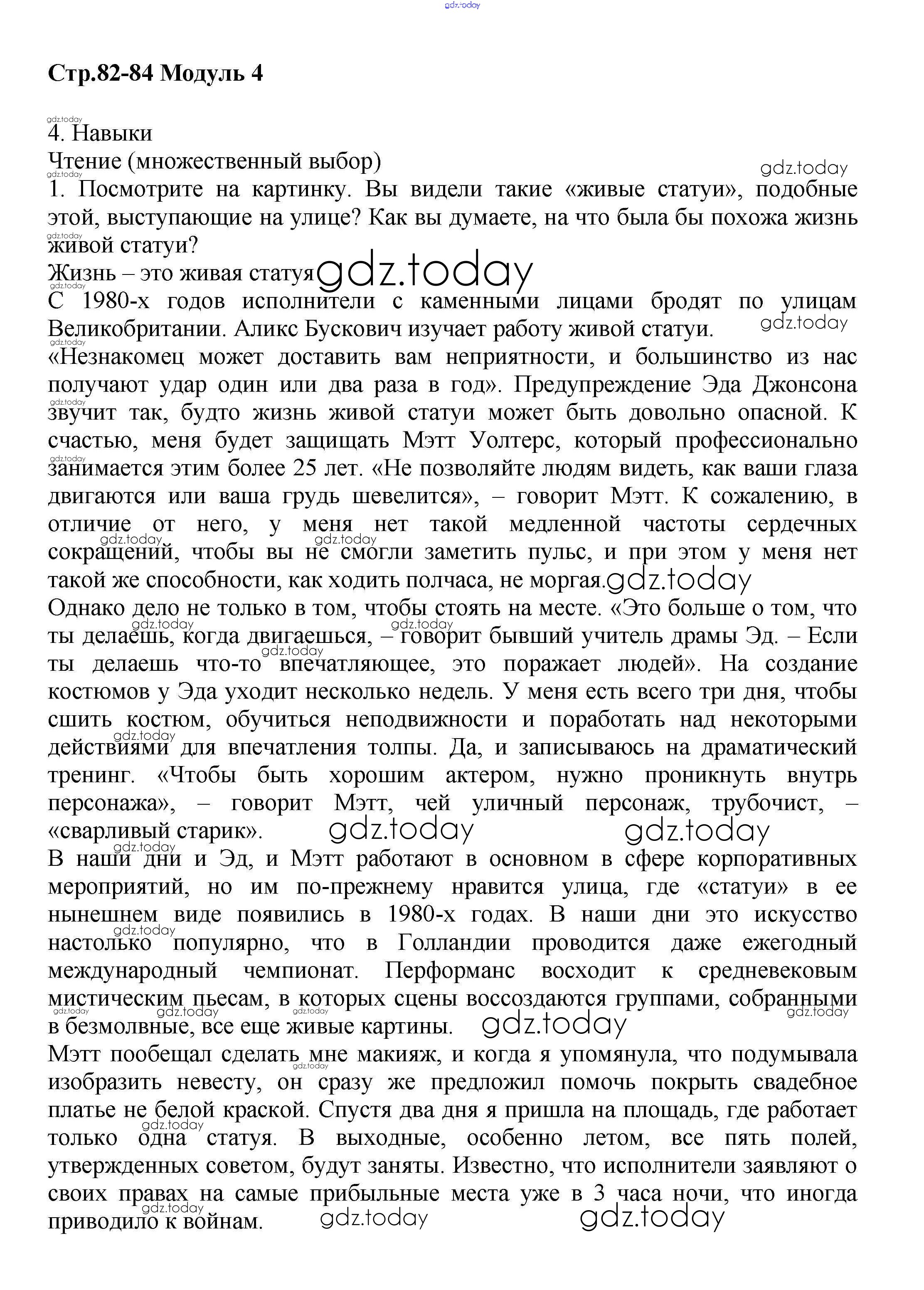 На страницах сайта gdz.today вы найдете учебный и вспомогательный материал, направленный на улучшения знаний школьной программы. ГДЗ - онлайн мир знаний Решение к Module 4. Art & Entertainment стр.82-84 Учебнику по Английскому языку для 9 класса Баранова, Дули Углубленный уровень Просвещение Starlight 2017