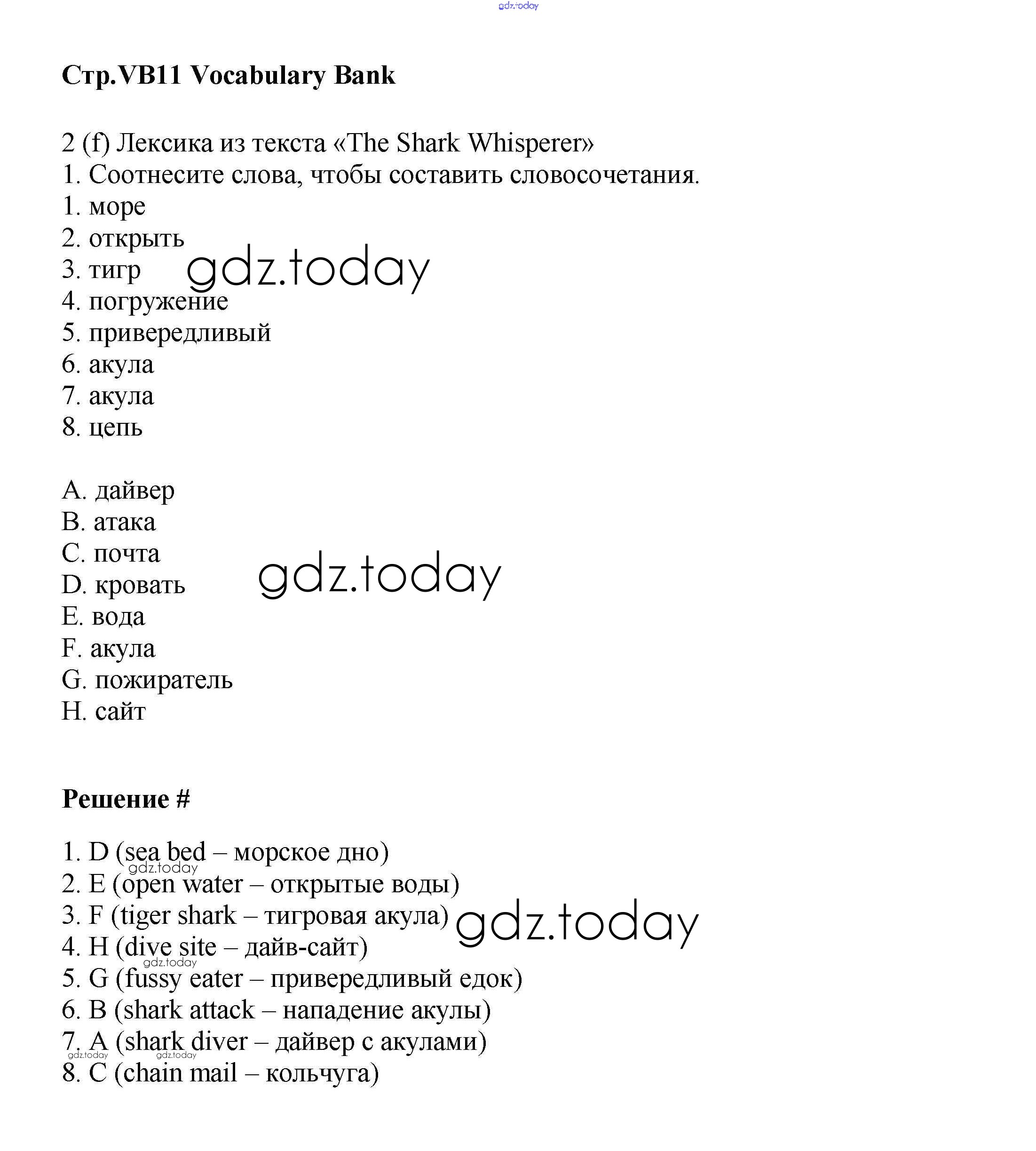 На страницах сайта gdz.today вы найдете учебный и вспомогательный материал, направленный на улучшения знаний школьной программы. ГДЗ - онлайн мир знаний Решение к Vocabulary Bank VB11 Учебнику по Английскому языку для 9 класса Баранова, Дули Углубленный уровень Просвещение Starlight 2017