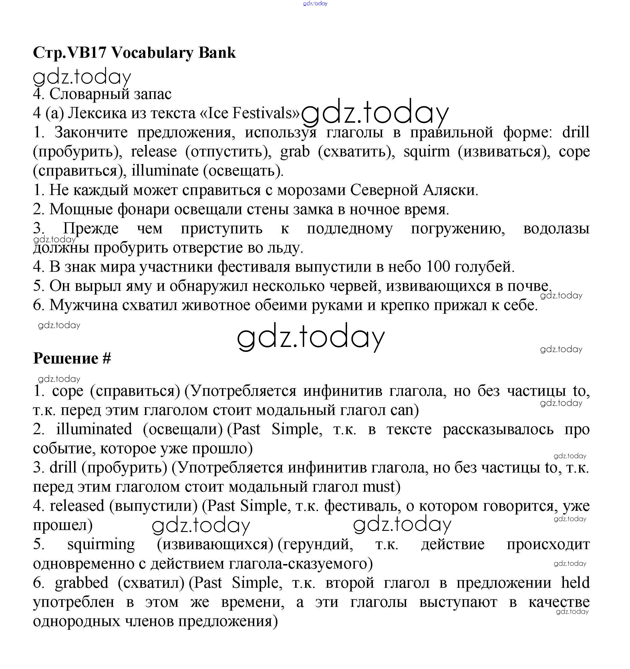 На страницах сайта gdz.today вы найдете учебный и вспомогательный материал, направленный на улучшения знаний школьной программы. ГДЗ - онлайн мир знаний Решение к Vocabulary Bank VB17 Учебнику по Английскому языку для 9 класса Баранова, Дули Углубленный уровень Просвещение Starlight 2017