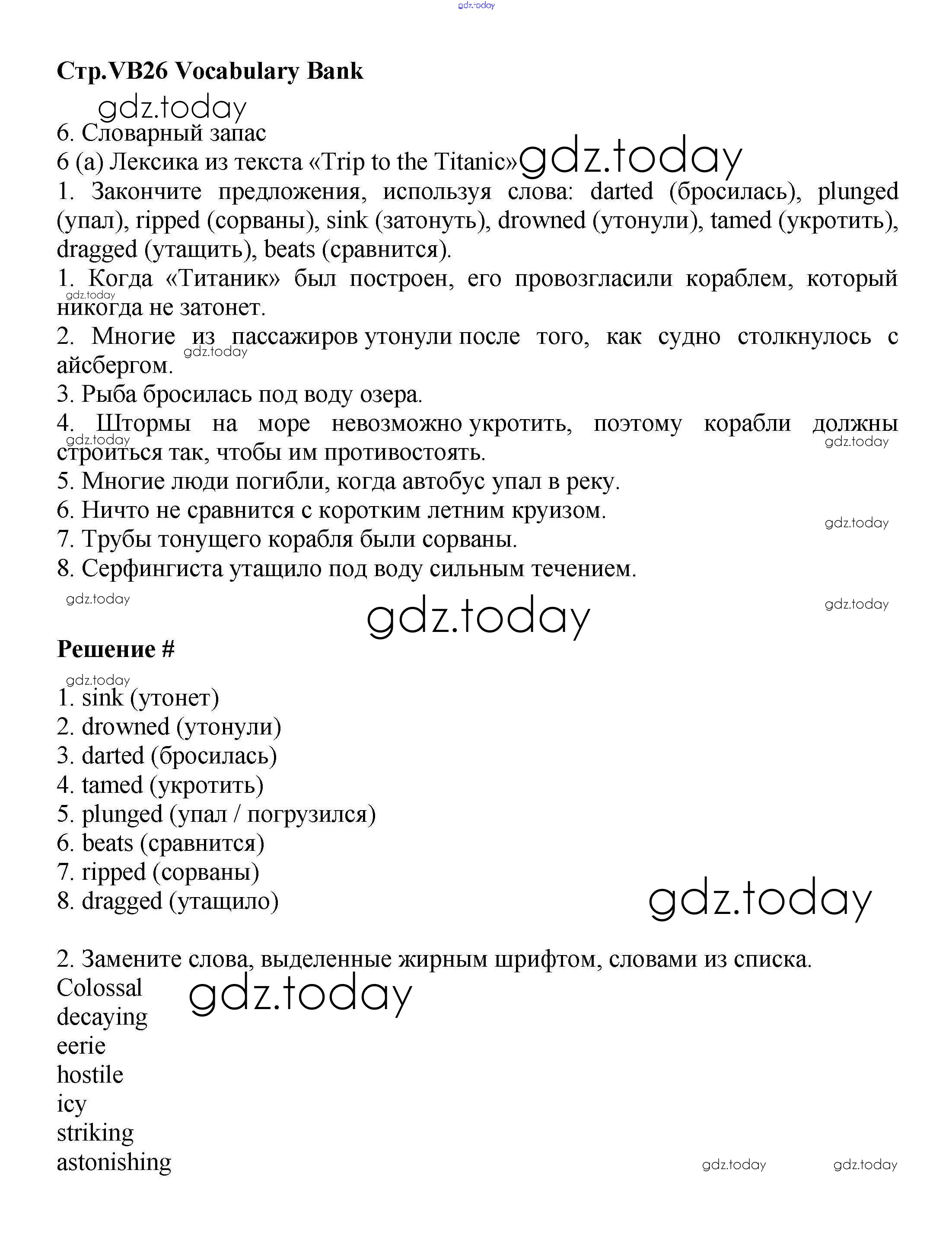На страницах сайта gdz.today вы найдете учебный и вспомогательный материал, направленный на улучшения знаний школьной программы. ГДЗ - онлайн мир знаний Решение к Vocabulary Bank VB26 Учебнику по Английскому языку для 9 класса Баранова, Дули Углубленный уровень Просвещение Starlight 2017