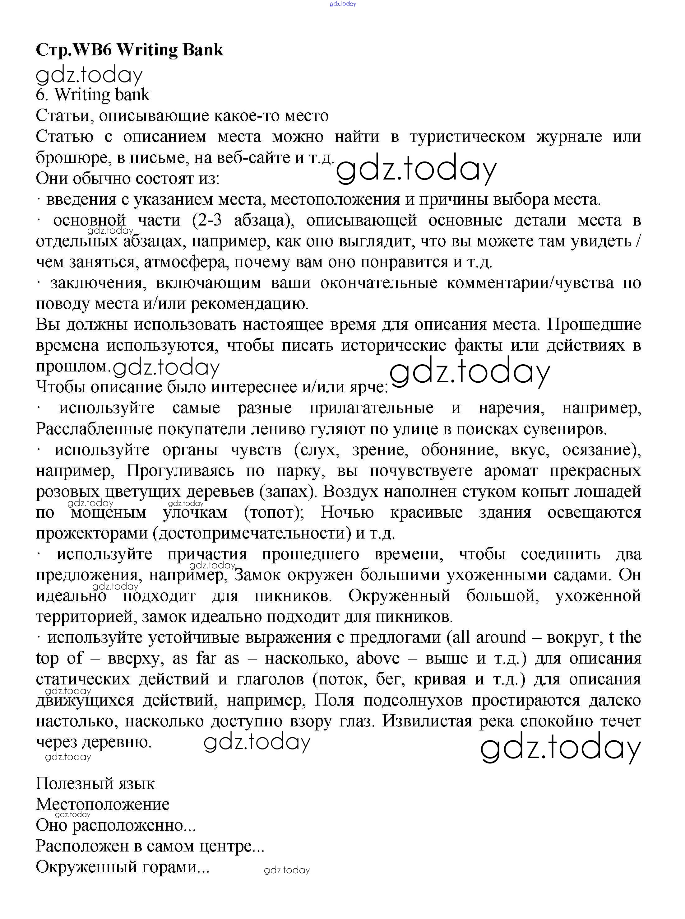 На страницах сайта gdz.today вы найдете учебный и вспомогательный материал, направленный на улучшения знаний школьной программы. ГДЗ - онлайн мир знаний Решение к Writing Bank WB6 Учебнику по Английскому языку для 9 класса Баранова, Дули Углубленный уровень Просвещение Starlight 2017