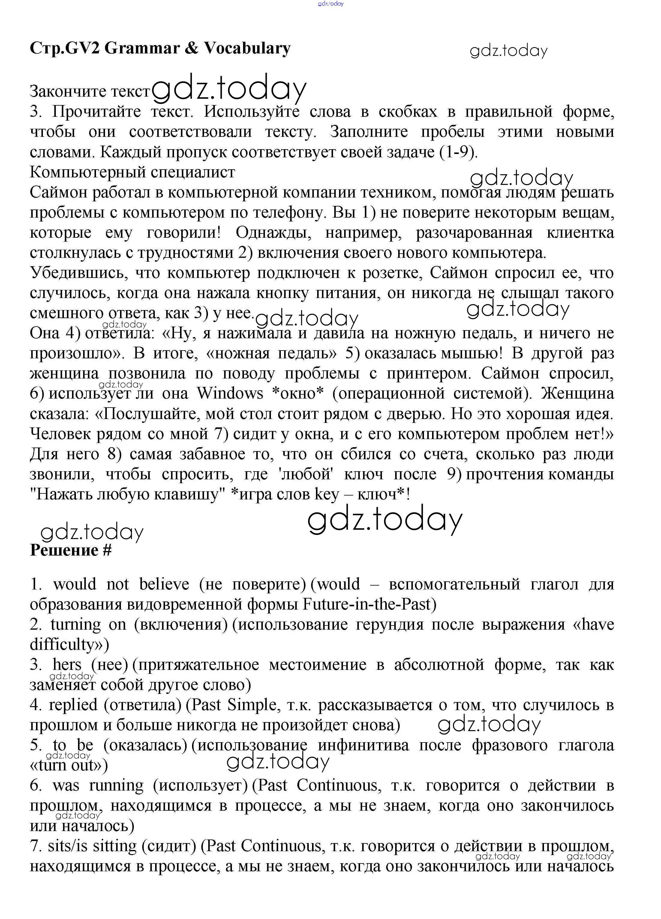 На страницах сайта gdz.today вы найдете учебный и вспомогательный материал, направленный на улучшения знаний школьной программы. ГДЗ - онлайн мир знаний Решение к Grammar & Vocabulary (Use of English) GV2 Учебнику по Английскому языку для 9 класса Баранова, Дули Углубленный уровень Просвещение Starlight 2017