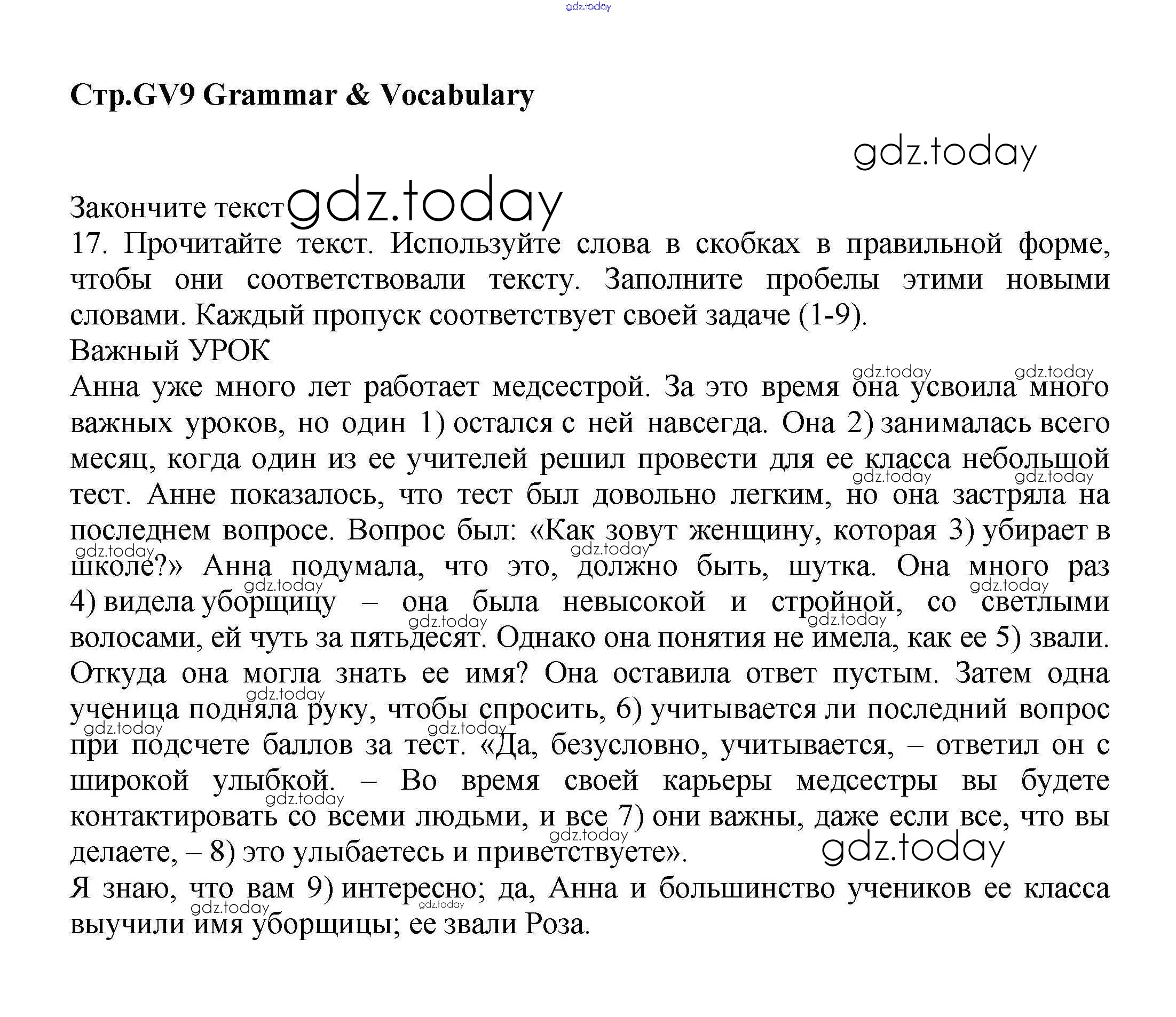 На страницах сайта gdz.today вы найдете учебный и вспомогательный материал, направленный на улучшения знаний школьной программы. ГДЗ - онлайн мир знаний Решение к Grammar & Vocabulary (Use of English) GV9 Учебнику по Английскому языку для 9 класса Баранова, Дули Углубленный уровень Просвещение Starlight 2017