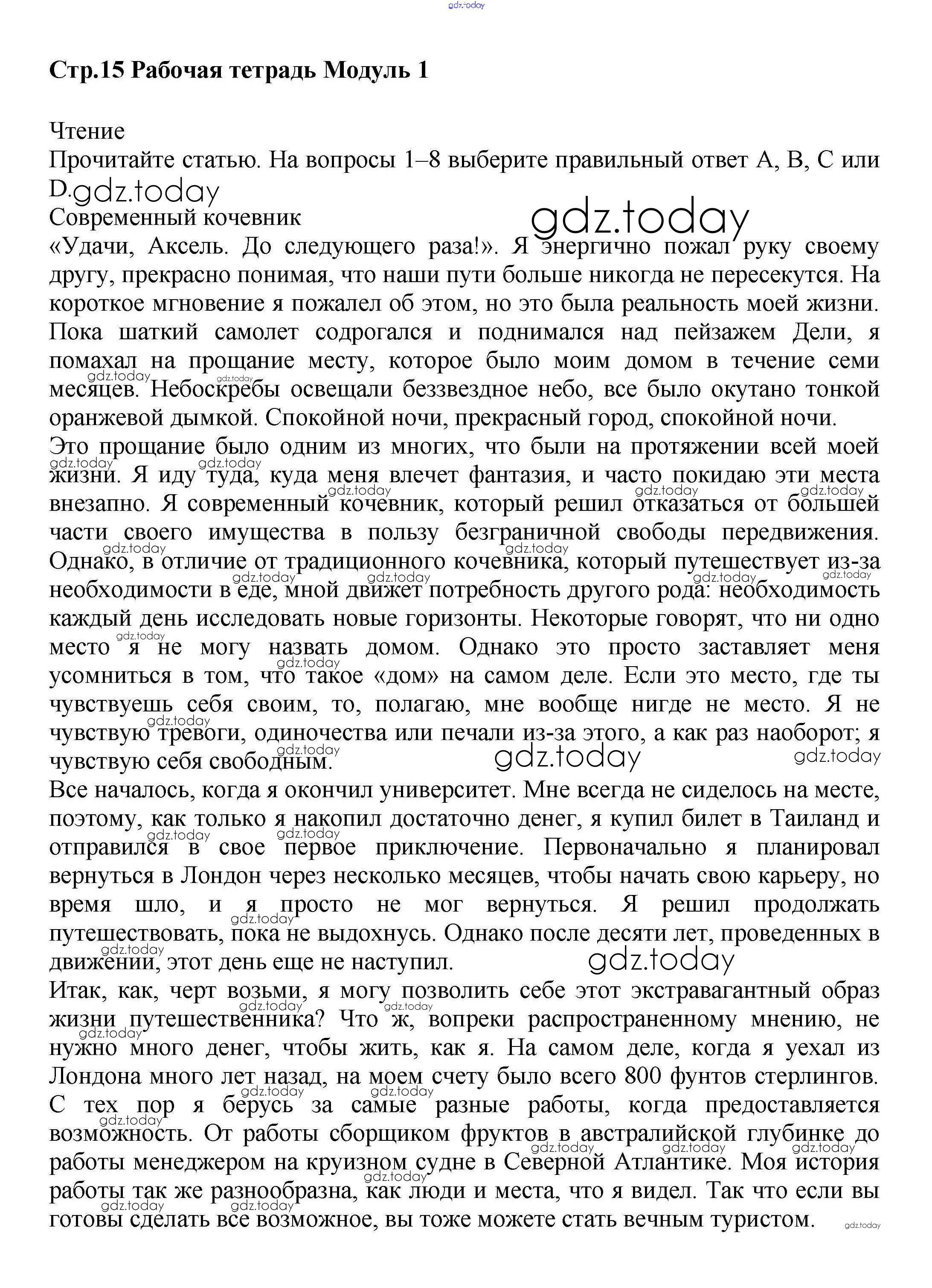 На страницах сайта gdz.today вы найдете учебный и вспомогательный материал, направленный на улучшения знаний школьной программы. ГДЗ - онлайн мир знаний Решение к Module 1 стр.15 Рабочей тетради по Английскому языку для 9 класса Баранова, Дули Углубленный уровень Просвещение Starlight 2017