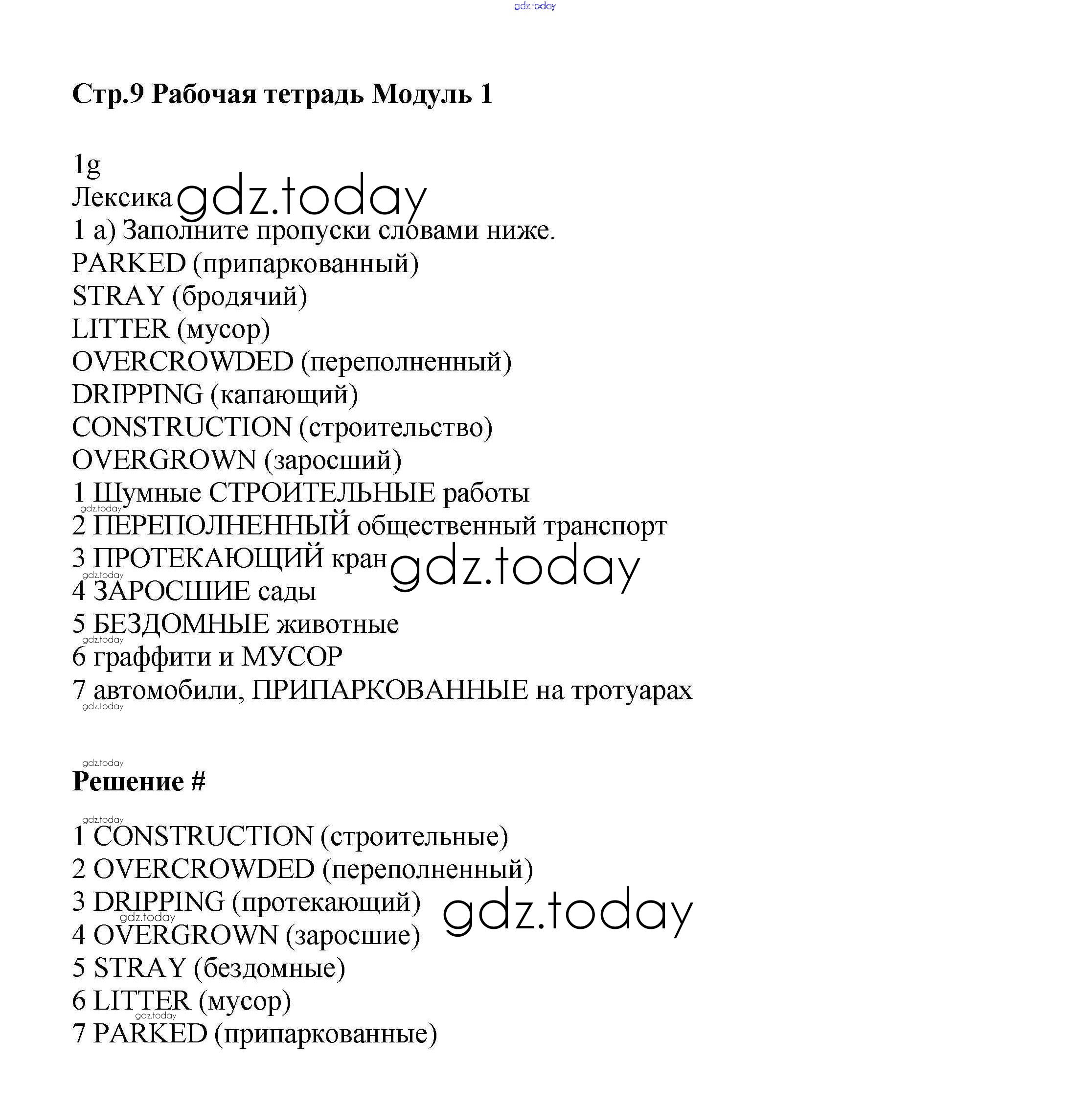 На страницах сайта gdz.today вы найдете учебный и вспомогательный материал, направленный на улучшения знаний школьной программы. ГДЗ - онлайн мир знаний Решение к Module 1 стр.9 Рабочей тетради по Английскому языку для 9 класса Баранова, Дули Углубленный уровень Просвещение Starlight 2017