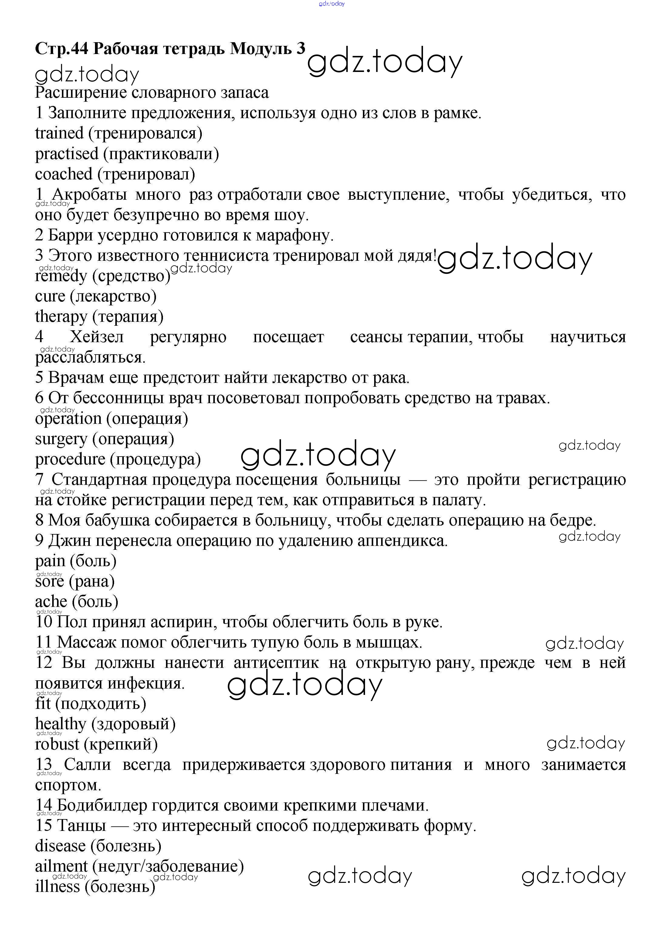 На страницах сайта gdz.today вы найдете учебный и вспомогательный материал, направленный на улучшения знаний школьной программы. ГДЗ - онлайн мир знаний Решение к Module 3 стр.44 Рабочей тетради по Английскому языку для 9 класса Баранова, Дули Углубленный уровень Просвещение Starlight 2017