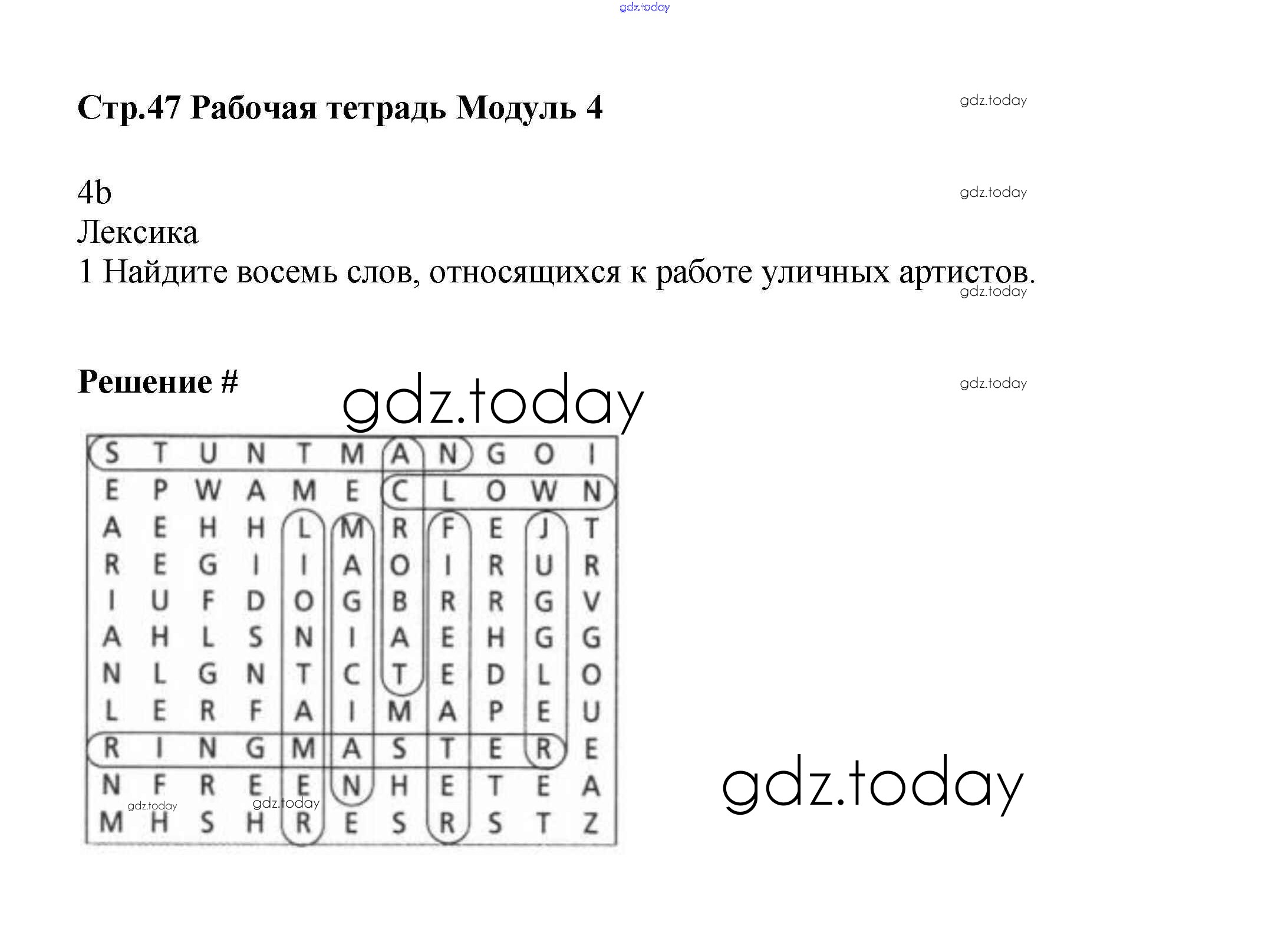 На страницах сайта gdz.today вы найдете учебный и вспомогательный материал, направленный на улучшения знаний школьной программы. ГДЗ - онлайн мир знаний Решение к Module 4 стр.47 Рабочей тетради по Английскому языку для 9 класса Баранова, Дули Углубленный уровень Просвещение Starlight 2017