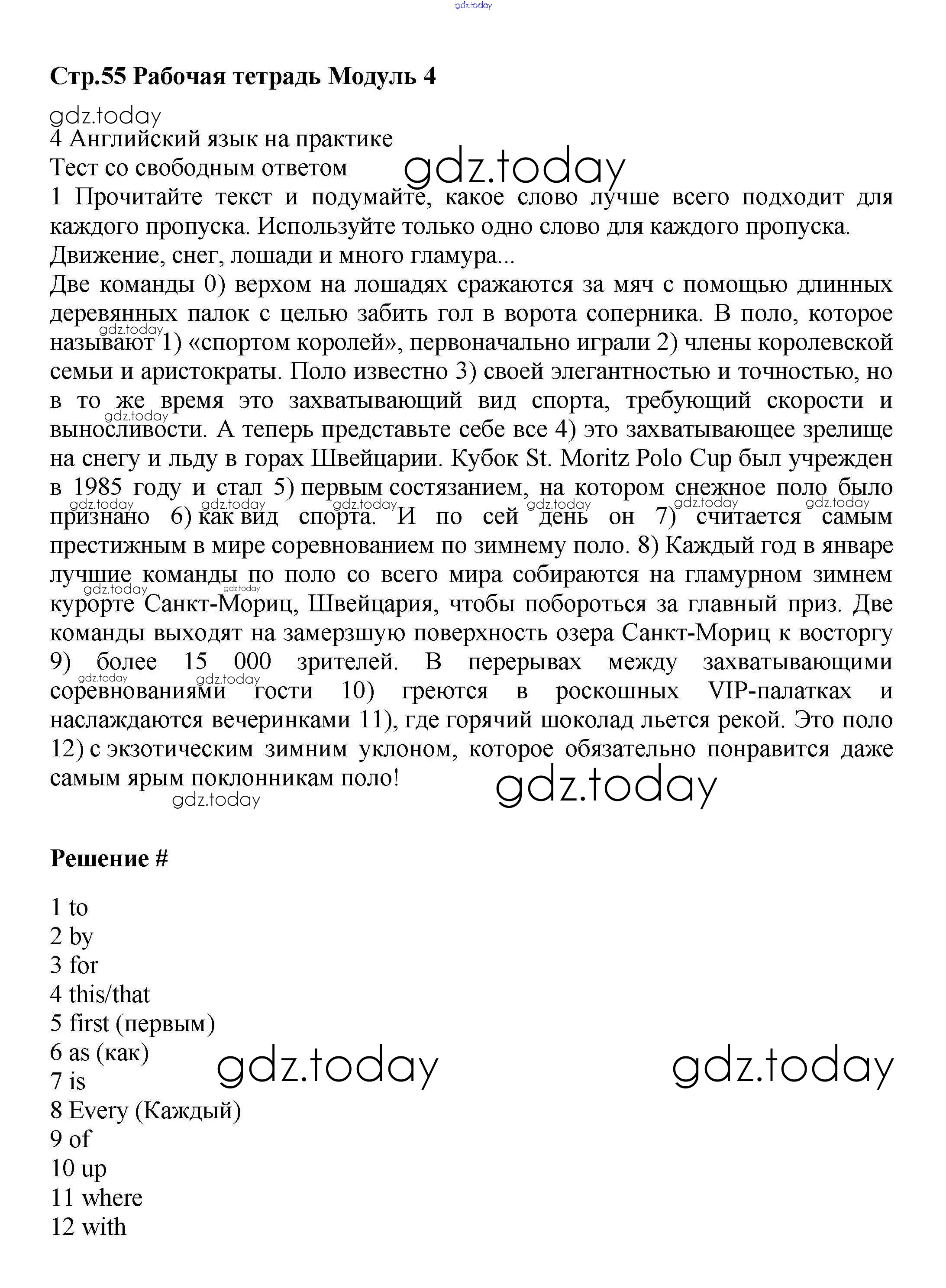 На страницах сайта gdz.today вы найдете учебный и вспомогательный материал, направленный на улучшения знаний школьной программы. ГДЗ - онлайн мир знаний Решение к Module 4 стр.55 Рабочей тетради по Английскому языку для 9 класса Баранова, Дули Углубленный уровень Просвещение Starlight 2017