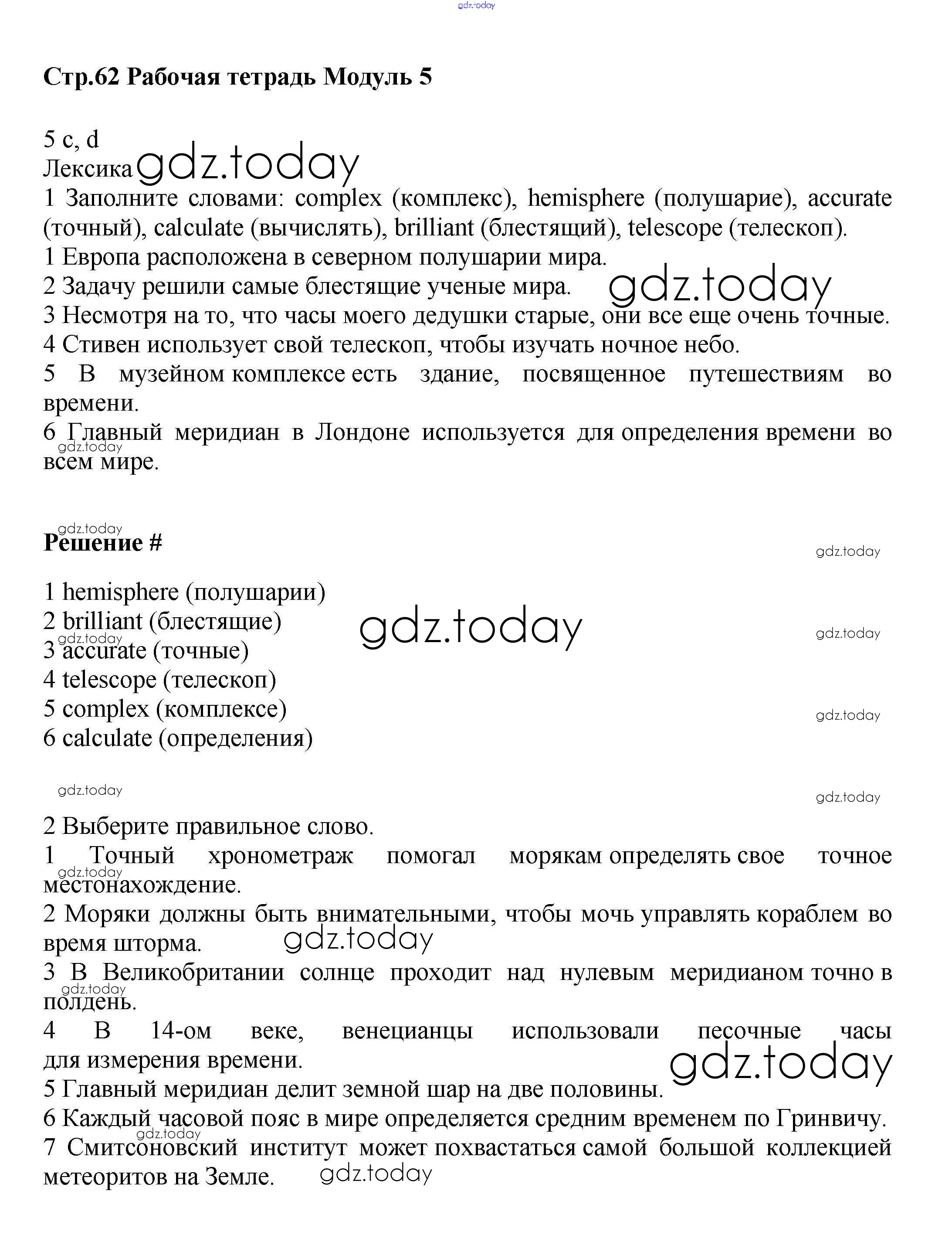 На страницах сайта gdz.today вы найдете учебный и вспомогательный материал, направленный на улучшения знаний школьной программы. ГДЗ - онлайн мир знаний Решение к Module 5 стр.62 Рабочей тетради по Английскому языку для 9 класса Баранова, Дули Углубленный уровень Просвещение Starlight 2017