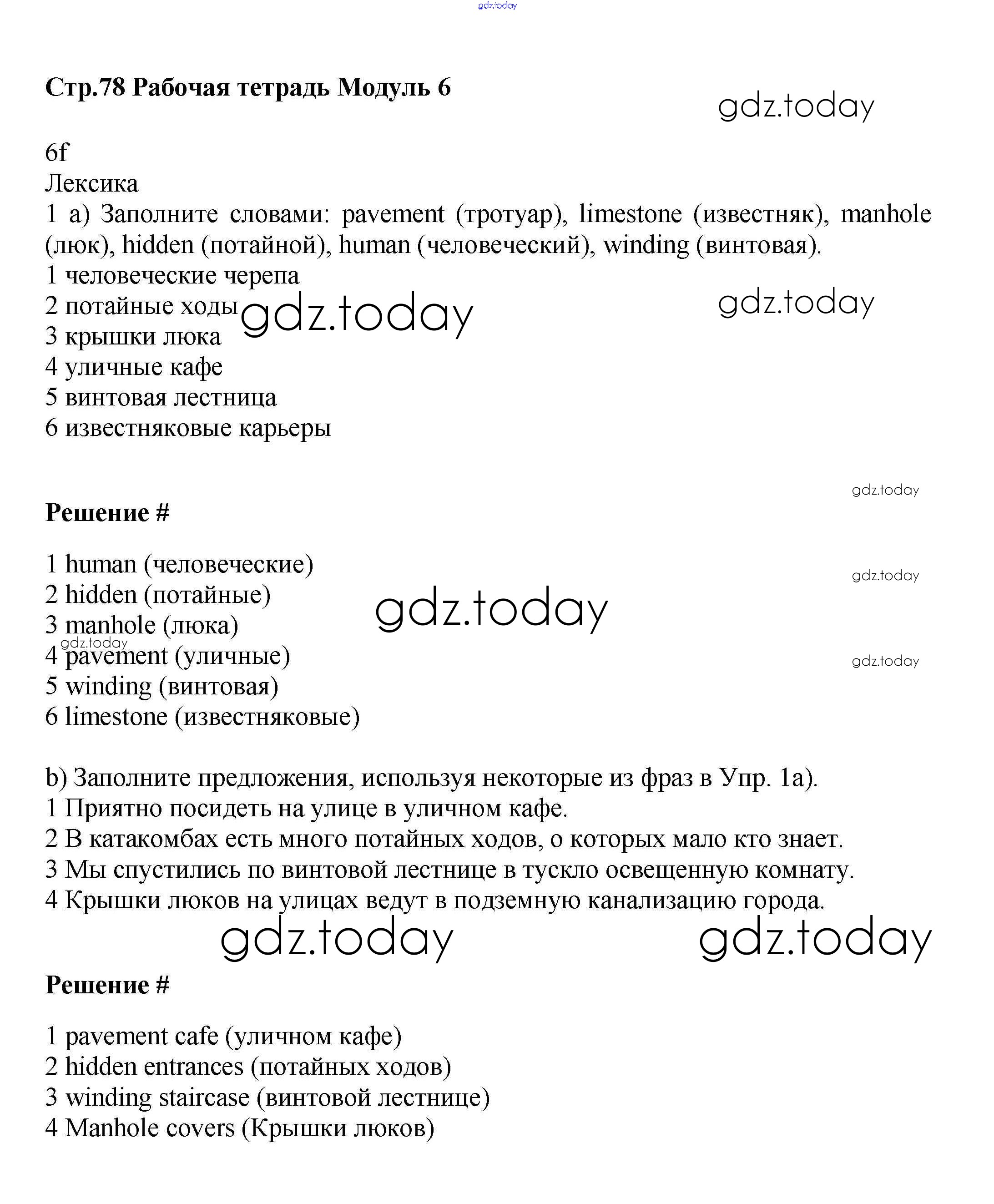 На страницах сайта gdz.today вы найдете учебный и вспомогательный материал, направленный на улучшения знаний школьной программы. ГДЗ - онлайн мир знаний Решение к Module 6 стр.78 Рабочей тетради по Английскому языку для 9 класса Баранова, Дули Углубленный уровень Просвещение Starlight 2017