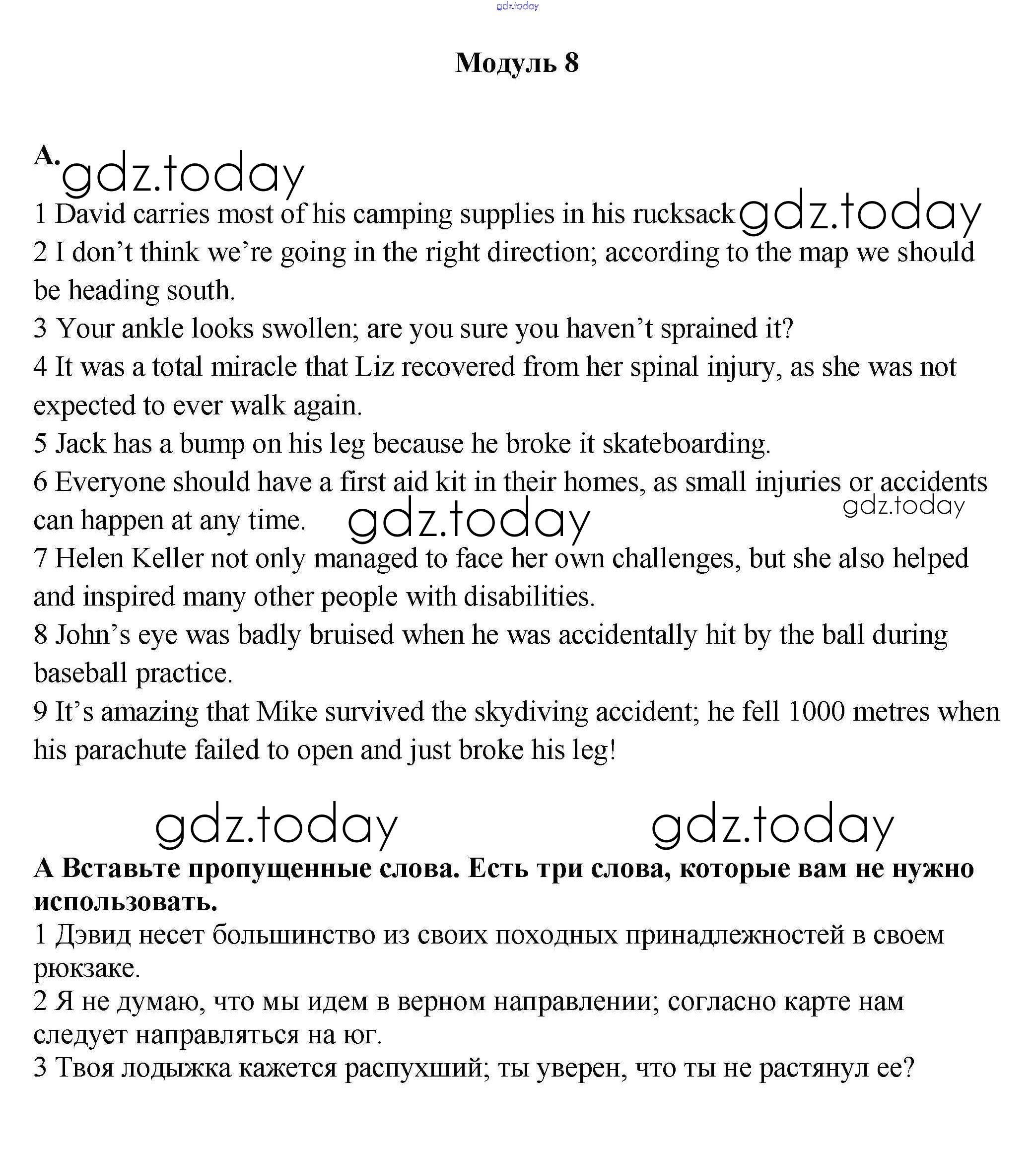 На страницах сайта gdz.today вы найдете учебный и вспомогательный материал, направленный на улучшения знаний школьной программы. ГДЗ - онлайн мир знаний Решение к Модулю 8 A Контрольным заданиям по Английскому языку для 9 класса Ваулина, Дули Просвещение Spotlight 2018