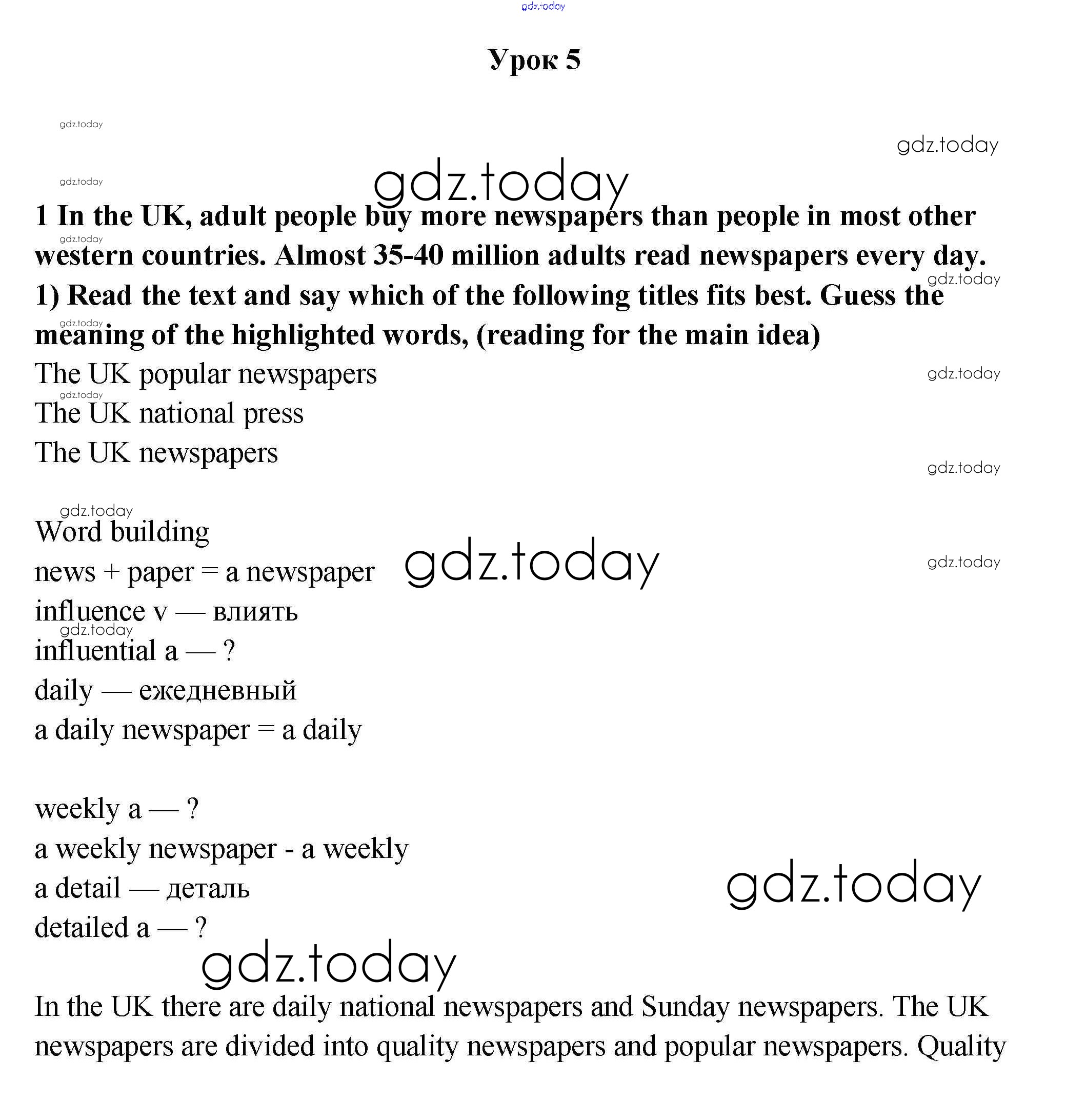 На страницах сайта gdz.today вы найдете учебный и вспомогательный материал, направленный на улучшения знаний школьной программы. ГДЗ - онлайн мир знаний Урок 5 Решение к Unit 3. What’s the news? 1 Учебнику по Английскому языку для 9 класса Кузовлев, Лапа Просвещение УМК 2015
